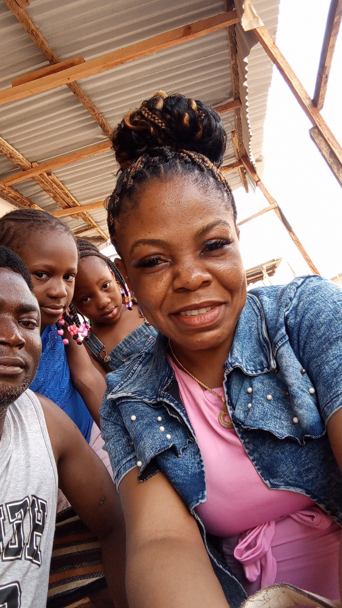 The image captures a selfie featuring a group of people in Sabon Tasha, Nigeria. A woman with braided hair styled in a high bun and wearing a pink top with a denim jacket embellished with pearls is in…read more