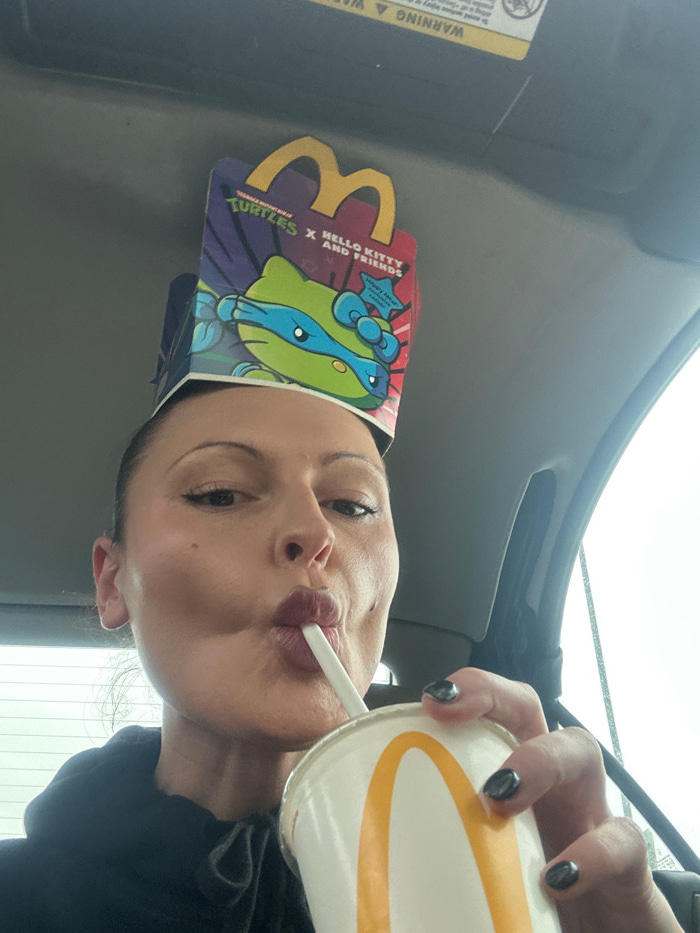 An adult female is depicted from the upper torso, seated within what appears to be the interior of a vehicle. Her dark hair is pulled back, and she wears visible makeup, including eyeliner and dark li…read more