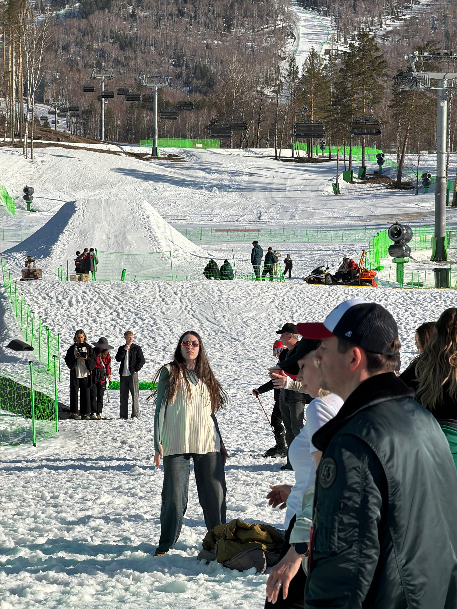 The image shows a snowy ski resort in Озёрное, Russia. Several people stand on the snow. Some are near a green fence, others near a ski lift. One person with long brown hair wears sunglasses and stand…read more