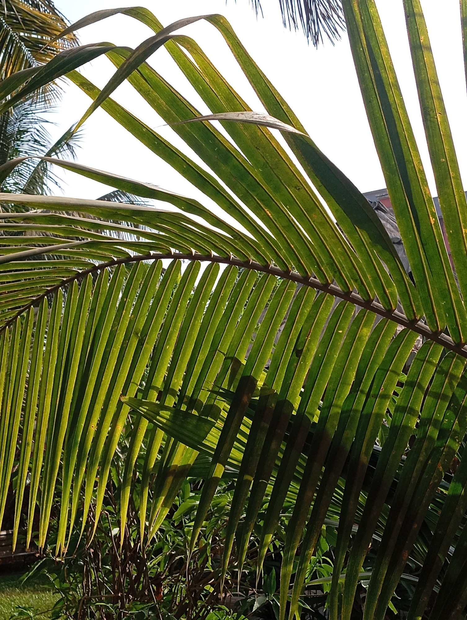 The image depicts a close-up view of palm fronds, likely in a tropical or subtropical environment. The fronds are green, linear, and arranged in a pinnate pattern, emanating from a central stem. The s…read more