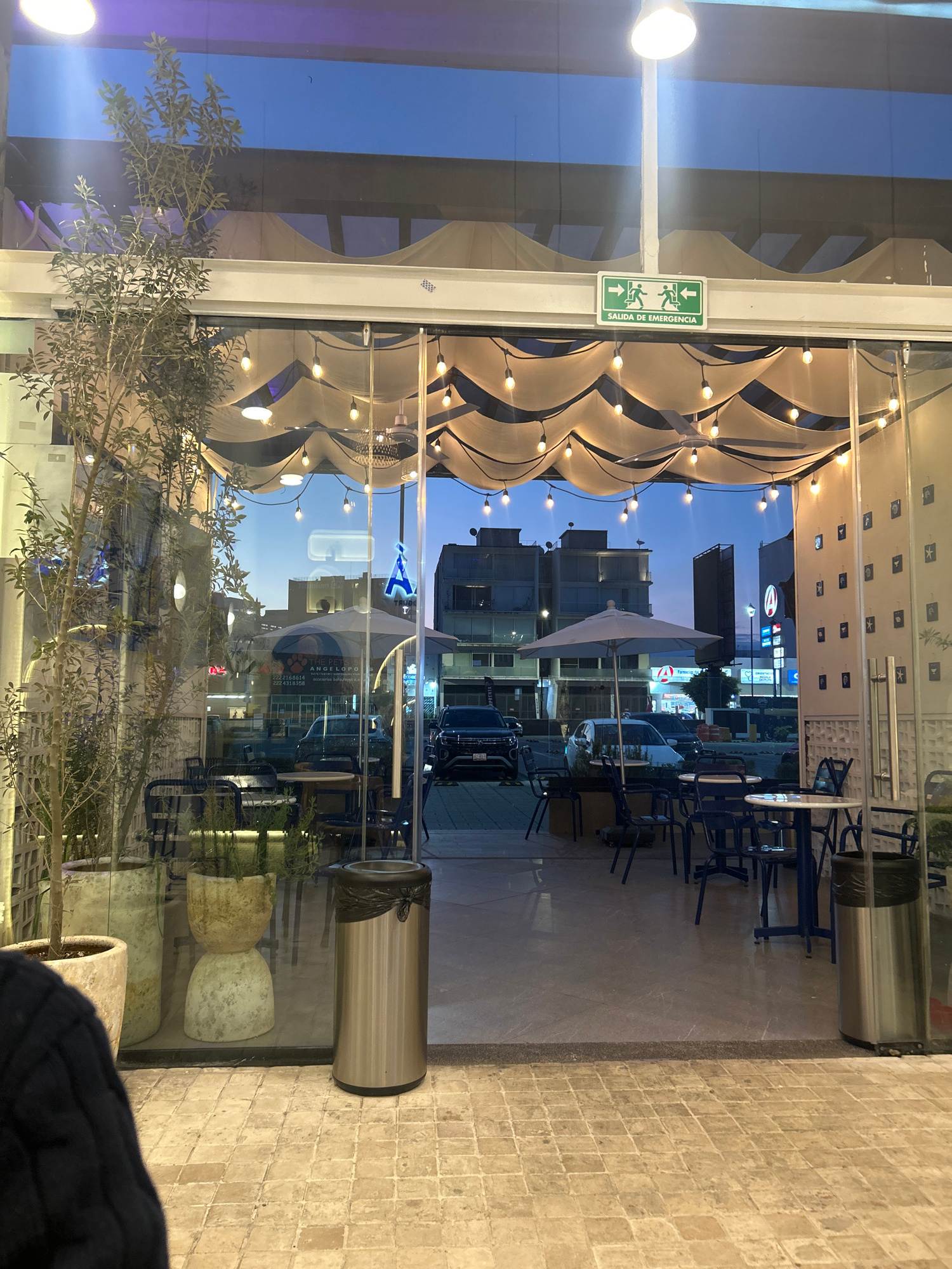 A daytime view through a glass facade reveals an outdoor patio area of a cafe or restaurant in San Bernardino Tlaxcalancingo, Mexico. Inside, potted plants are near the glass. The glass facade featureβ¦read more