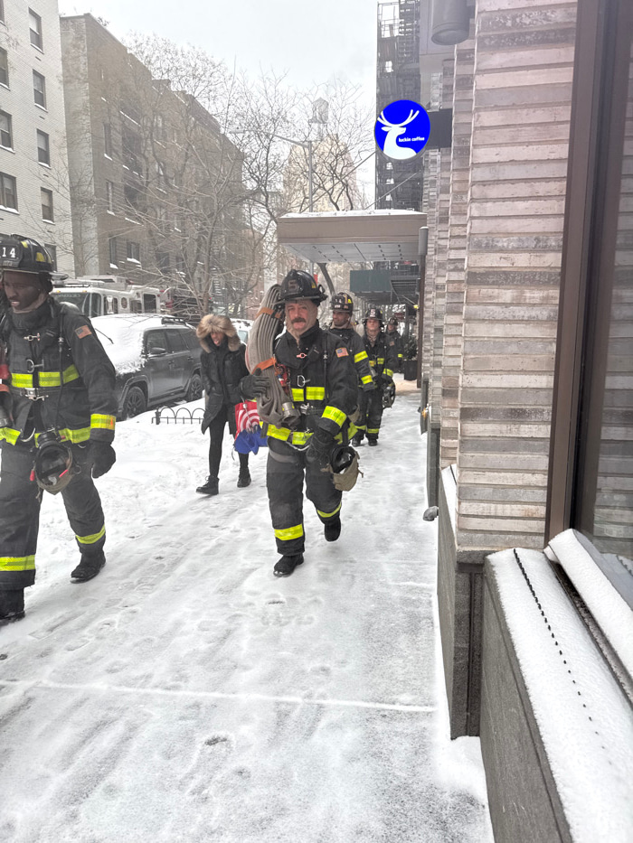 A line of firefighters in full gear stands in the snow, facing the camera. The first firefighter smiles and holds a coiled hose. Behind them are emergency vehicles and a person in a fur-trimmed coat.…read more