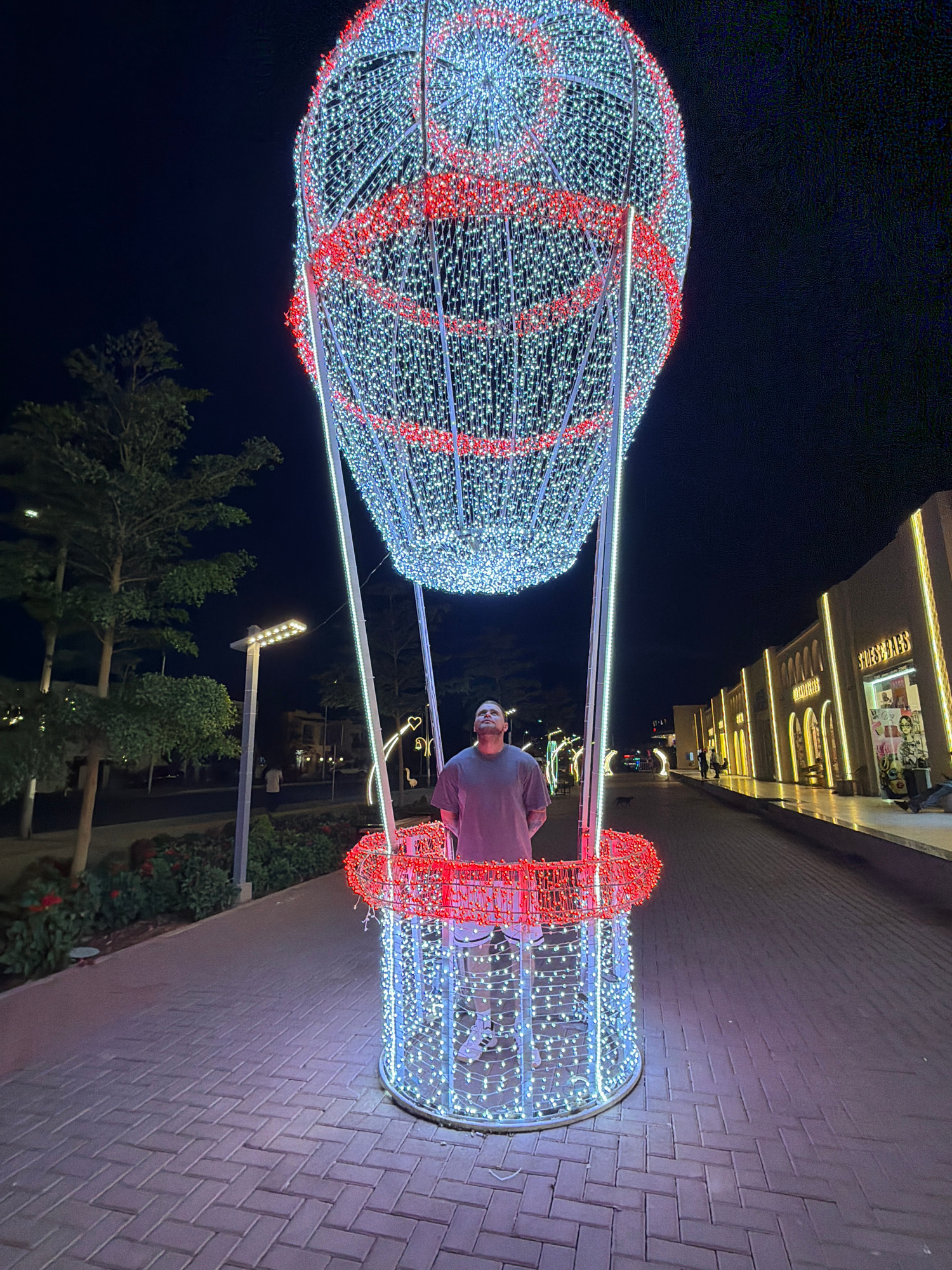 The photograph depicts a man standing inside a Christmas light decoration shaped like a hot air balloon in Sharm El Sheikh, Egypt, at night. The hot air balloon decoration is illuminated with red and…read more