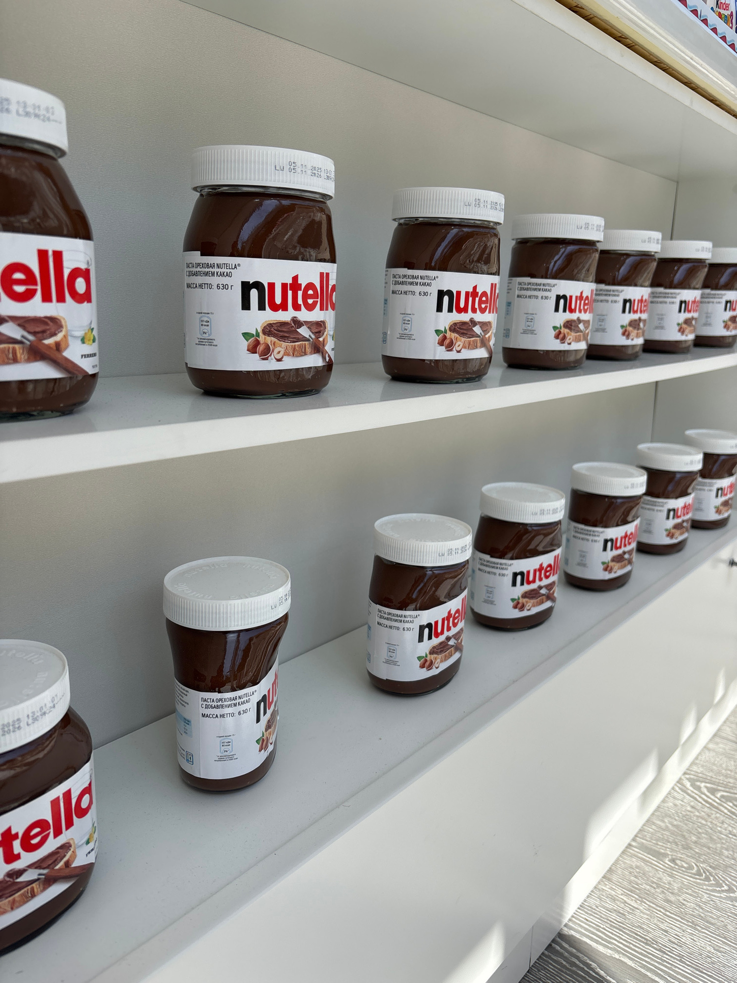 The image shows rows of Nutella jars on a white shelf. The jars have white lids and labels with the Nutella logo and product information in Cyrillic script. The label identifies the product as hazelnu…read more