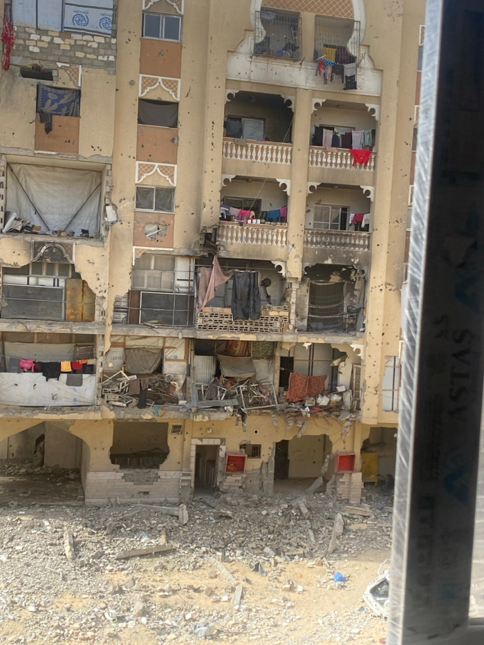 The image displays a severely damaged multi-story residential building in Khan Yunis, Palestinian Territory. The building's light-colored facade exhibits extensive destruction, characterized by numeroβ¦read more