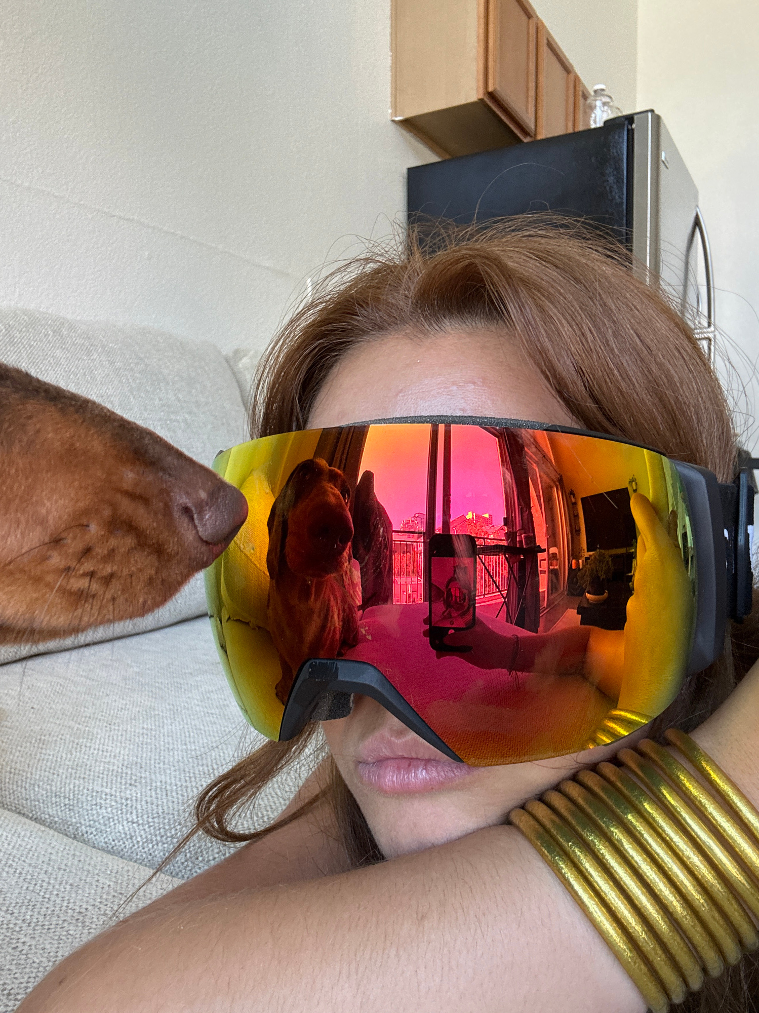The image displays an indoor scene located in San Diego, United States of America. The primary subject is an adult individual with reddish-brown hair, whose face is partially obscured by large, irides…read more