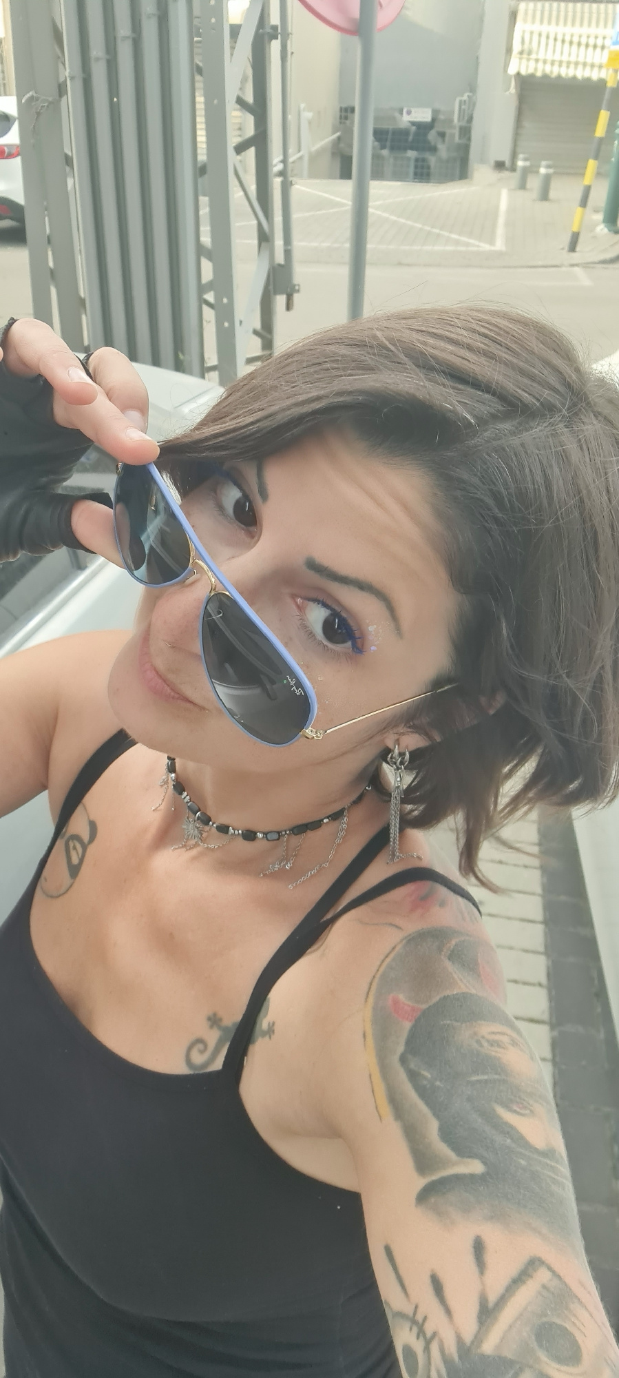 A woman is posing for a selfie in what appears to be an industrial or commercial area in Rishon LeZion, Israel. She is holding a pair of light blue Ray-Ban sunglasses in her left hand. The woman has s…read more