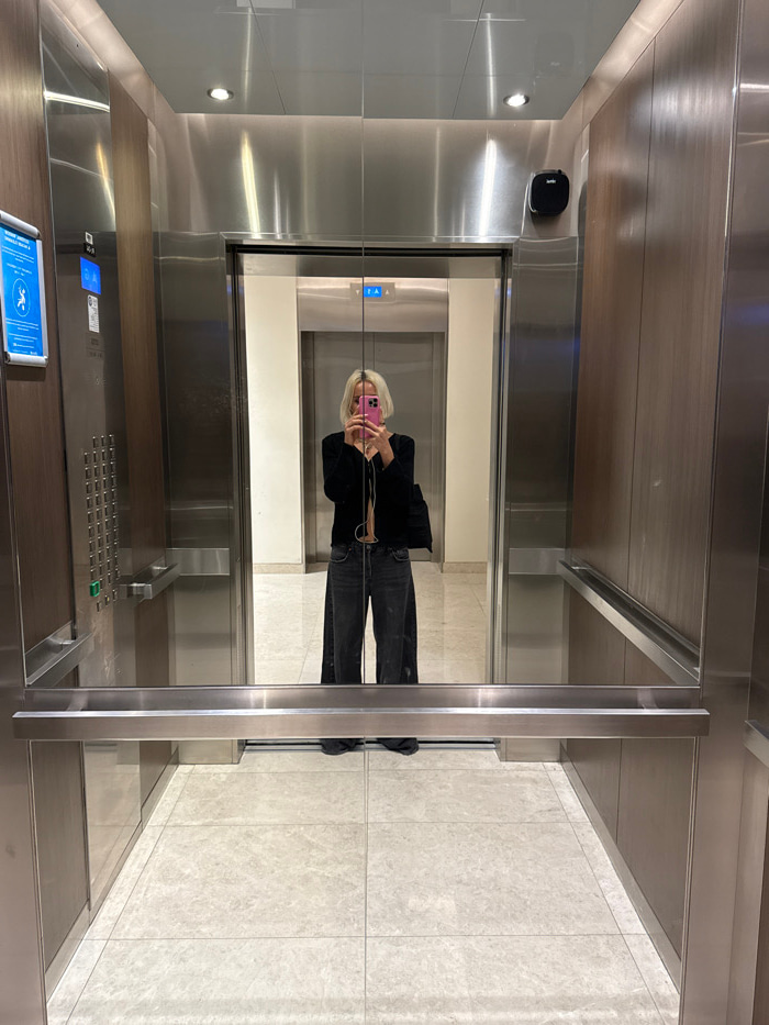 A photo taken inside a stainless steel elevator. A person with blond hair takes a mirror selfie, holding a pink phone. The reflection shows the person wearing a black jacket and dark jeans. The elevat…read more
