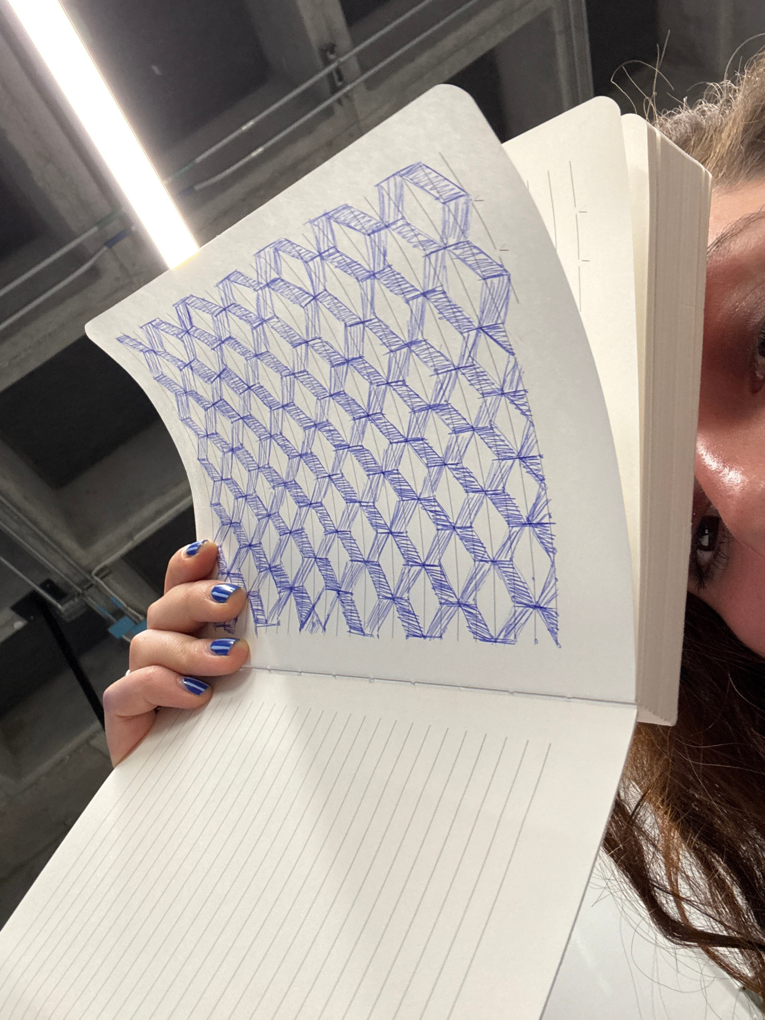 A person with brown hair and brown eyes looks down at an open notebook. The left page of the notebook contains a pattern of blue cubes drawn in pen, while the right page is lined and blank. The person…read more