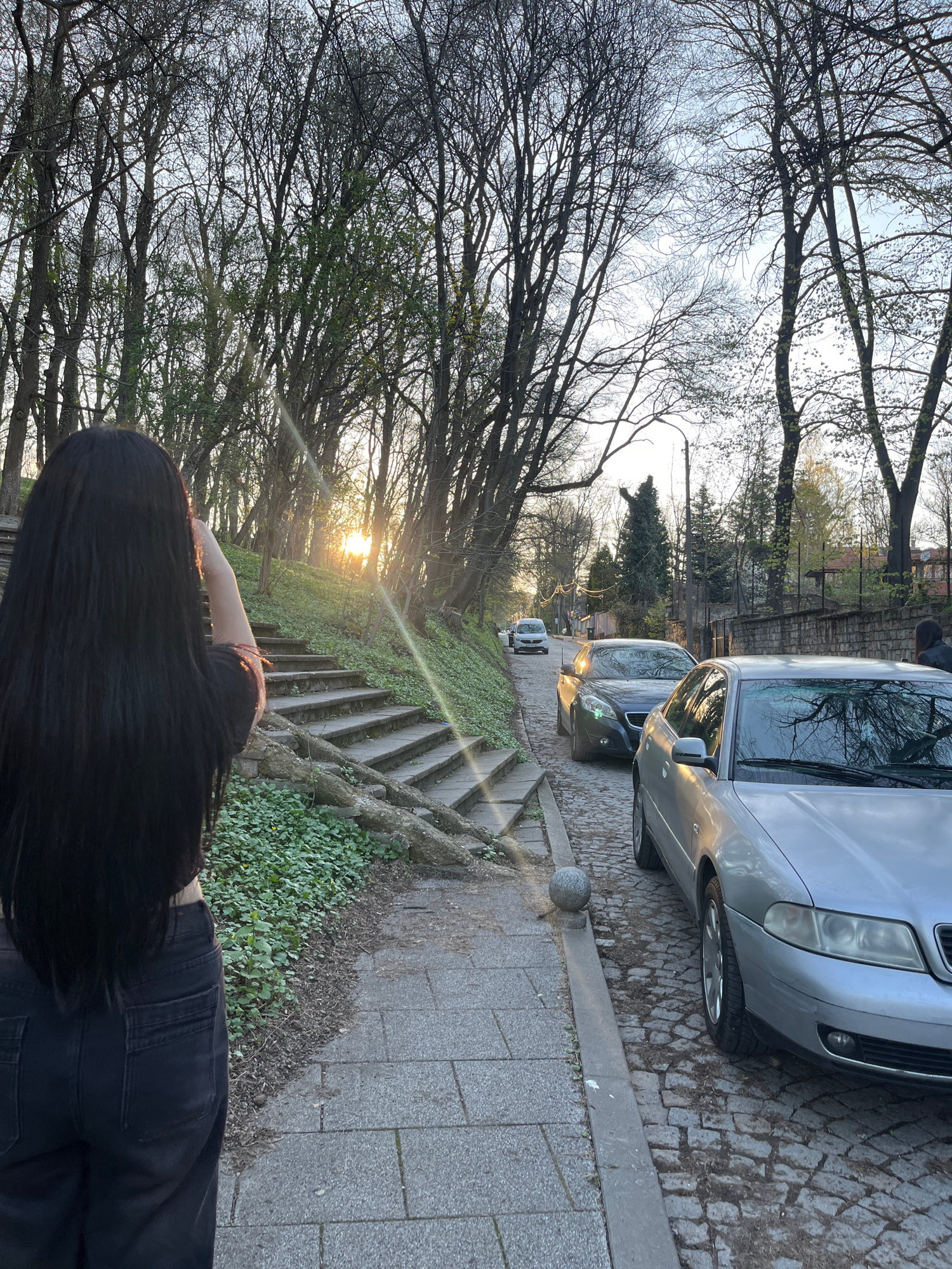 A woman with long, dark hair and wearing black jeans and a dark jacket stands with her back to the camera, gazing down a street lined with parked cars and trees. The street slopes downward and has ste…read more