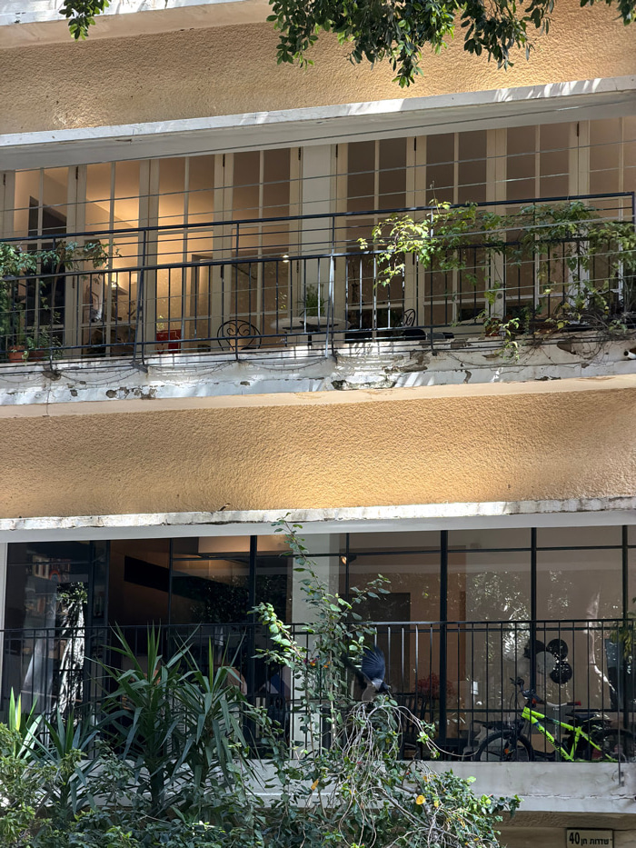 The image depicts the facade of a multi-story building located at 40 Yarden Street, Tel-Aviv, Israel, as indicated by a partial street sign. The building features light yellow stucco walls with white…read more