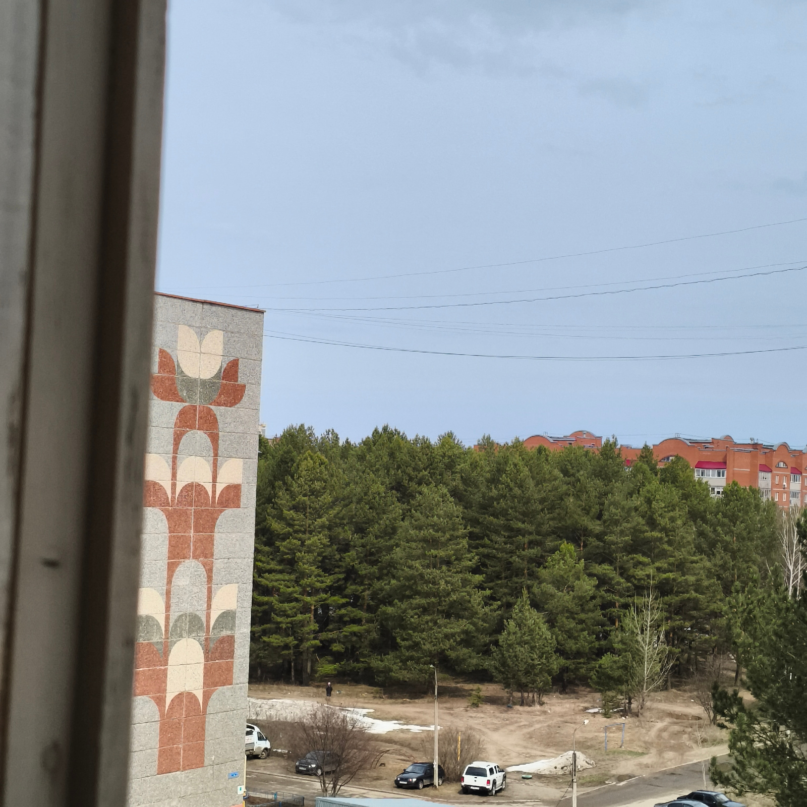 The image shows a view from an elevated position, possibly a window, in Chaikovsky, Russia. In the foreground, part of a building with a decorative pattern on its facade is visible. Beyond that, there…read more