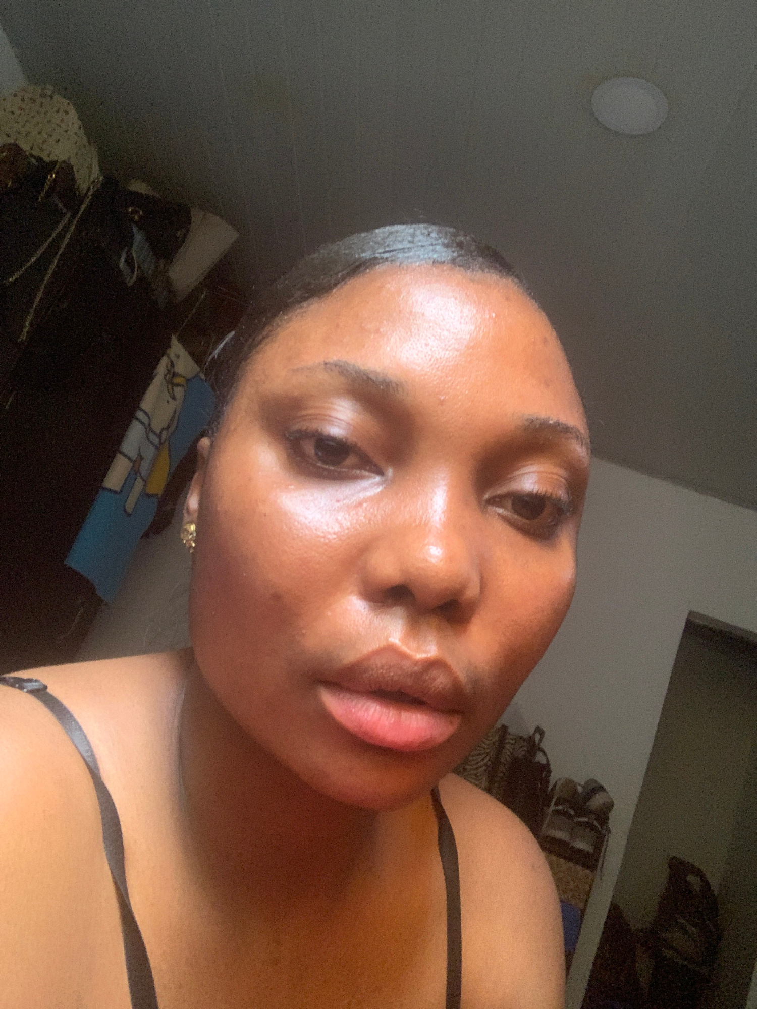 A close-up, upward-angled shot focuses on the face of a dark-skinned person with sleek, dark hair. The lighting is somewhat dim. The person has glossy lips, and an earring is visible in their left ear…read more