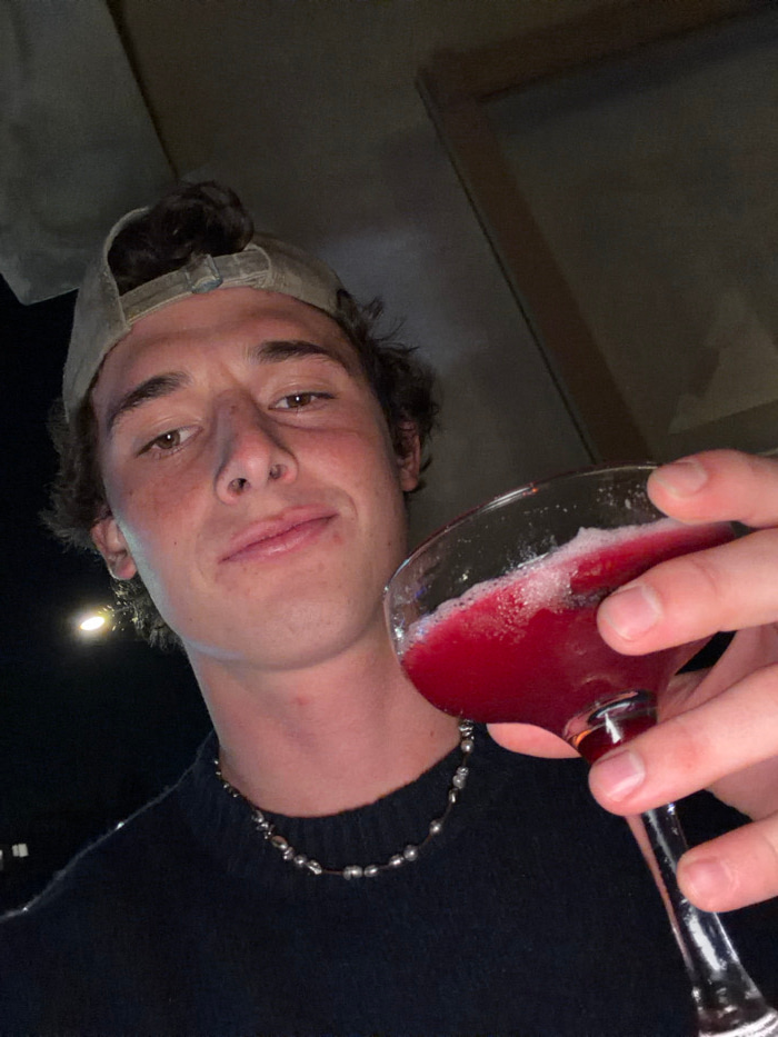 A young man is holding a glass of pink liquid. He has brown hair, brown eyes, and is wearing a baseball cap backwards. He is also wearing a black sweater and a pearl necklace. The photo is taken from…read more