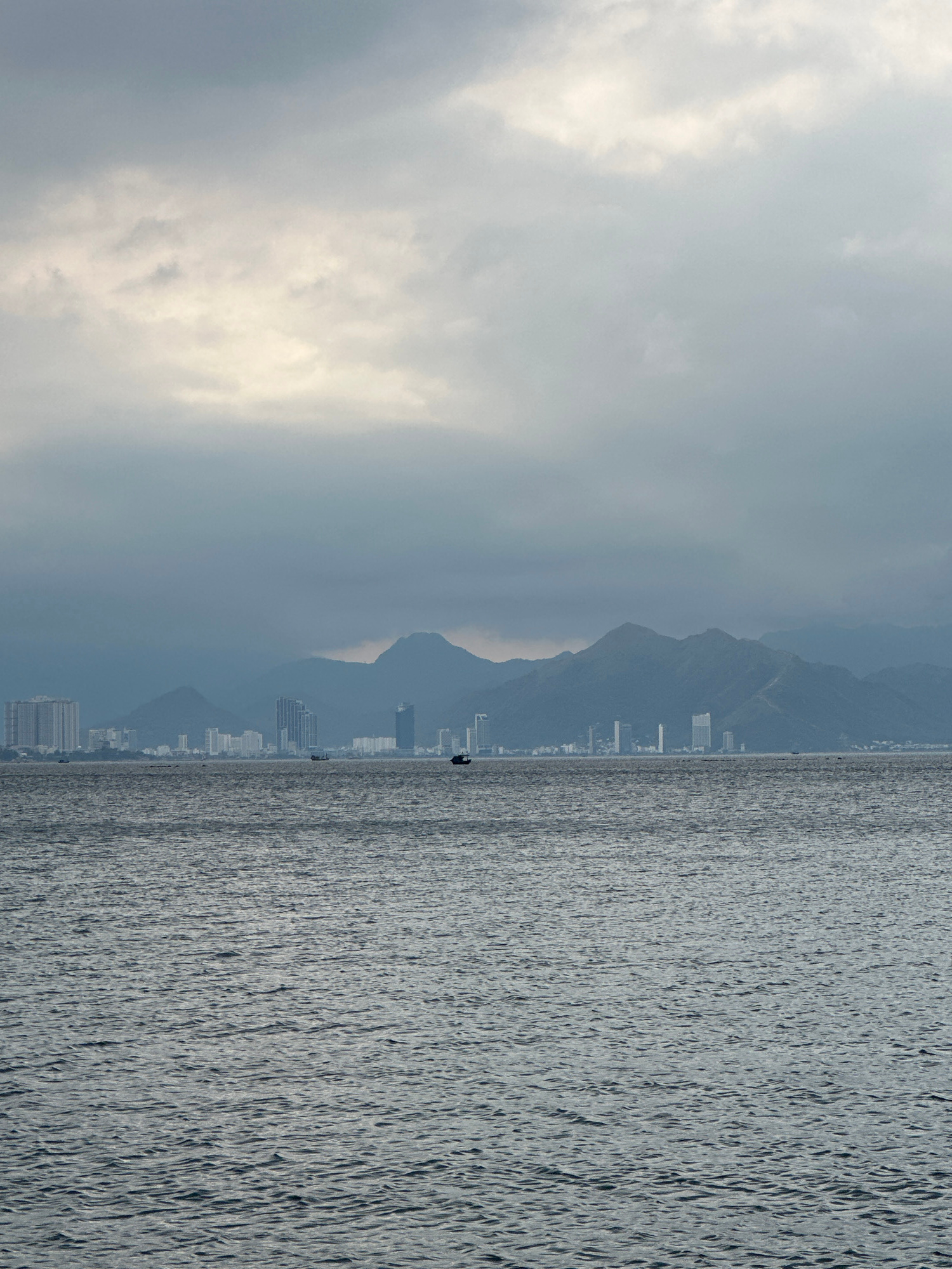This wide landscape image depicts a serene coastal or lakeside scene under an overcast sky. A vast body of water occupies the foreground and mid-ground, characterized by a textured surface of small, c…read more