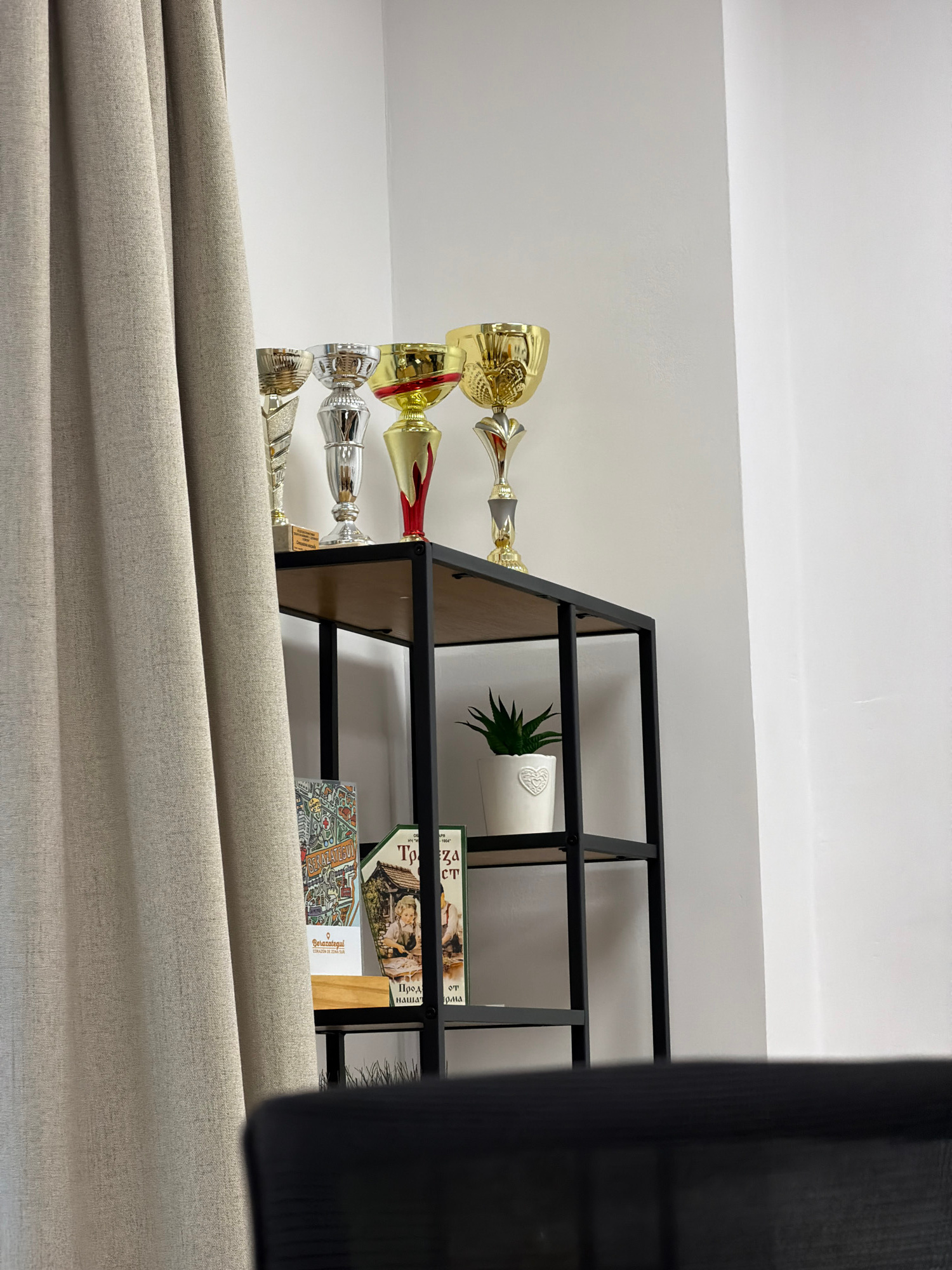 The image shows a shelf unit placed against a white wall. The shelf is black and contains items, including a potted plant, books, and a row of trophies. The bottom part of the image shows a light grey…read more
