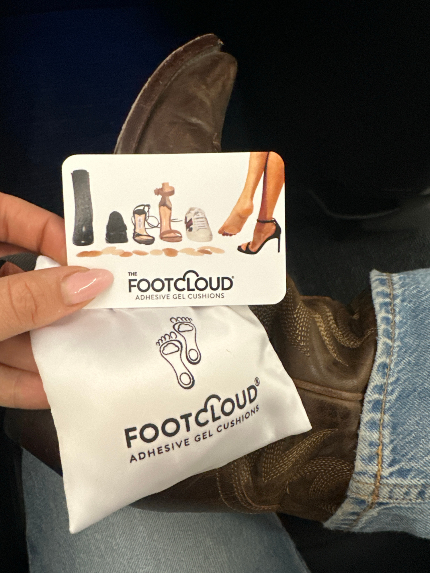 The image depicts a person sitting in what appears to be an airplane seat, wearing denim jeans and brown cowboy boots. They are holding a Footcloud adhesive gel cushion product package and its accompa…read more