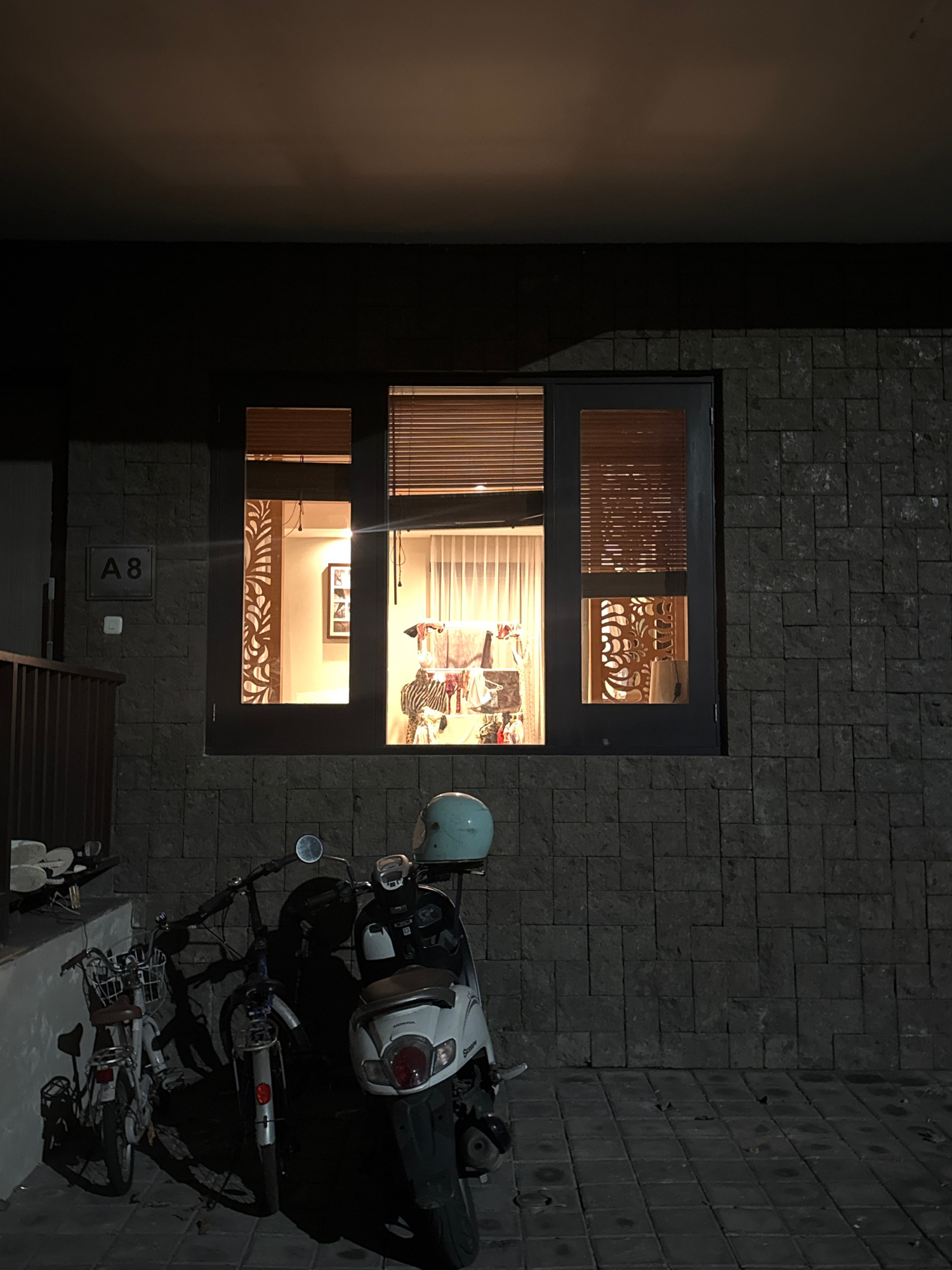 A nighttime exterior shot shows the corner of a building with a wall made of gray stone blocks and a large dark window. The window has three sections, with the top and bottom sections containing woode…read more