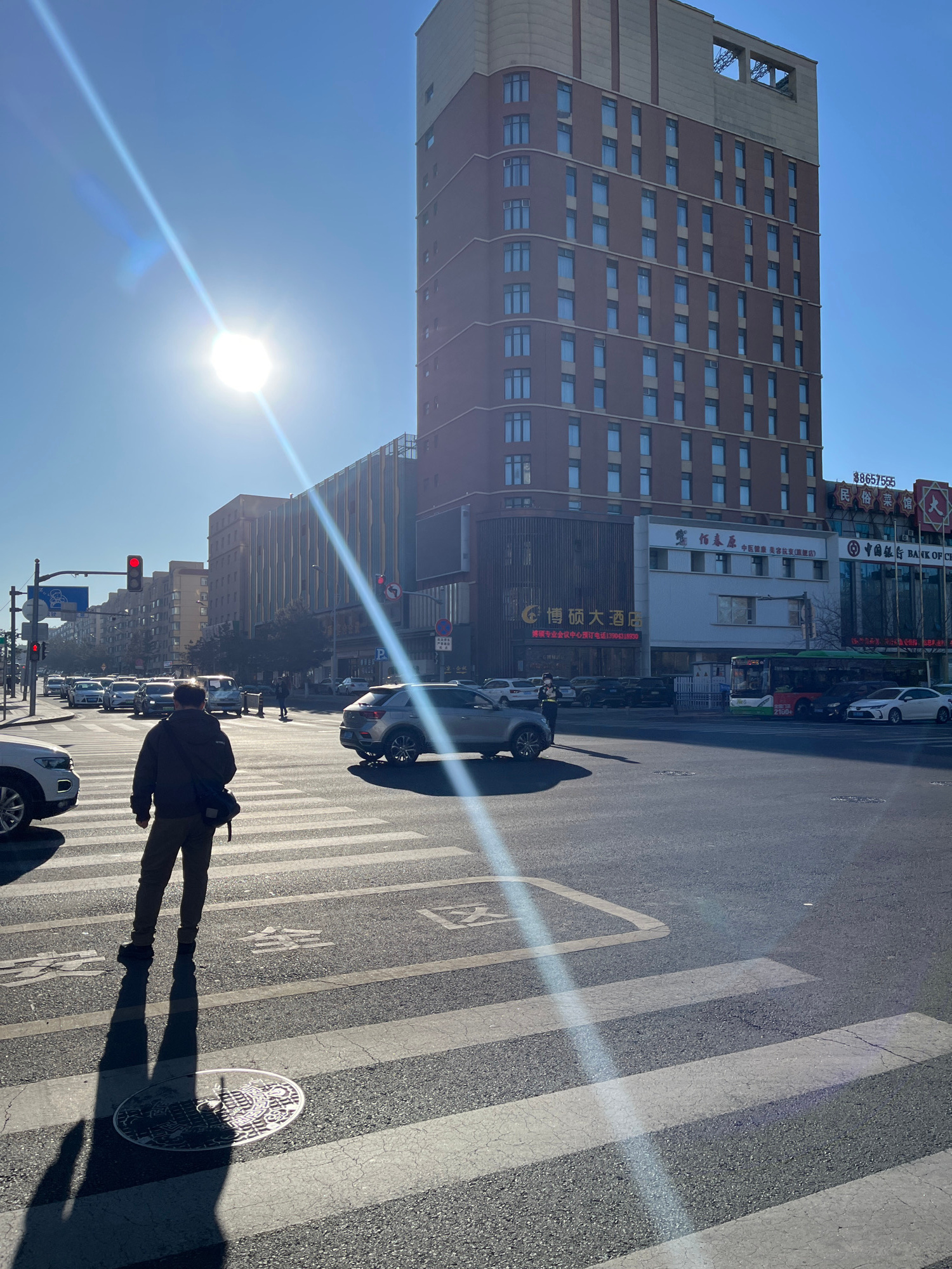 The image shows a street scene in Changchun City, China on a sunny day. A person walks across a zebra-striped crosswalk with their shadow stretched out on the pavement. The street is lined with cars a…read more