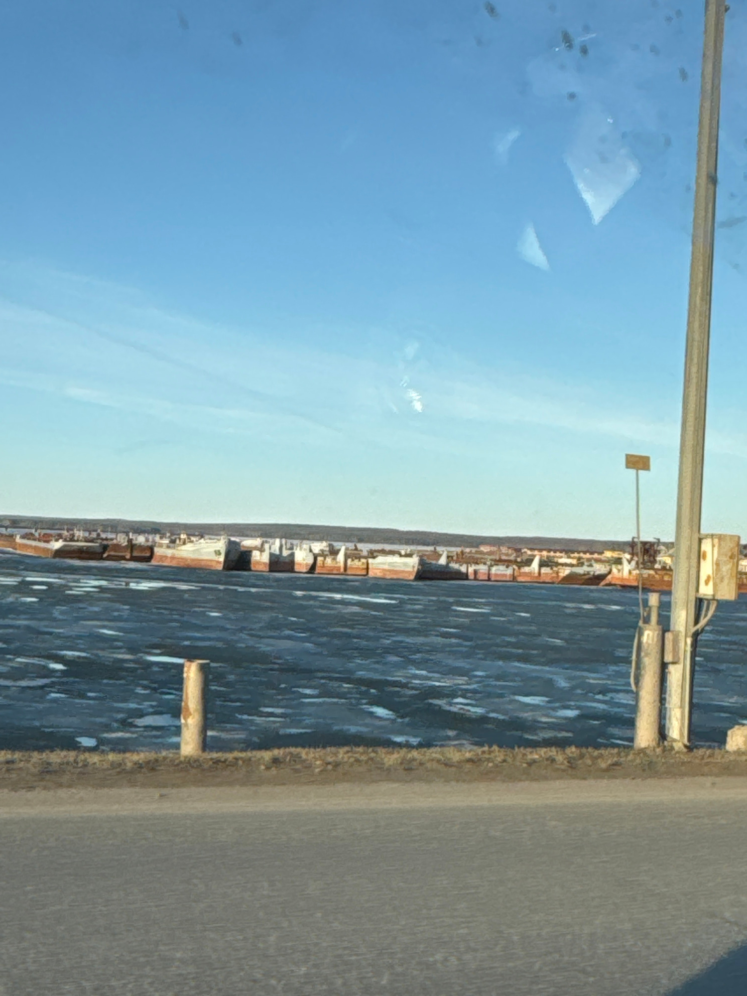 The image shows a view from a vehicle (possibly a car or bus) in Chaikovsky, Russia. The sky is a clear, light blue with a few faint clouds visible. A metal pole with some equipment attached runs alon…read more
