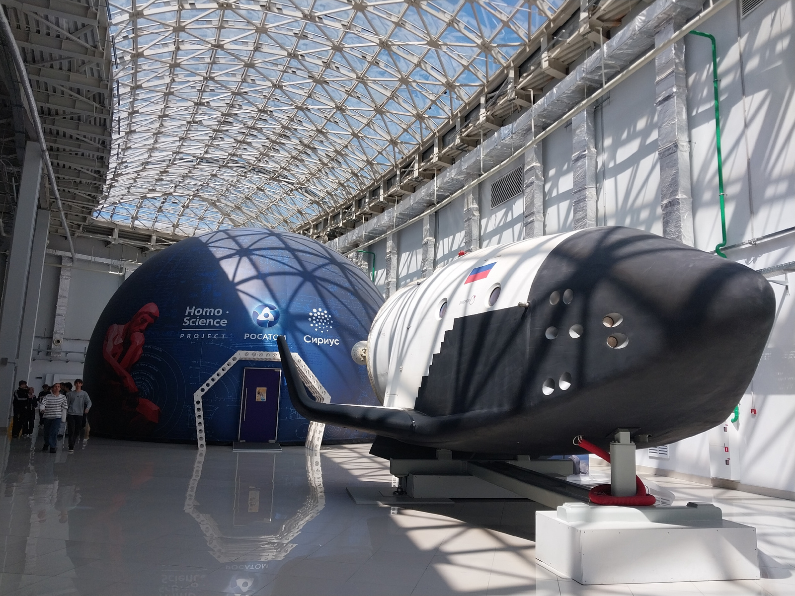 The image captures an indoor exhibition in the city of Sirius, Russia, within a large hall featuring a complex, latticed glass roof that allows ample natural light. On the left stands a large, spheric…read more