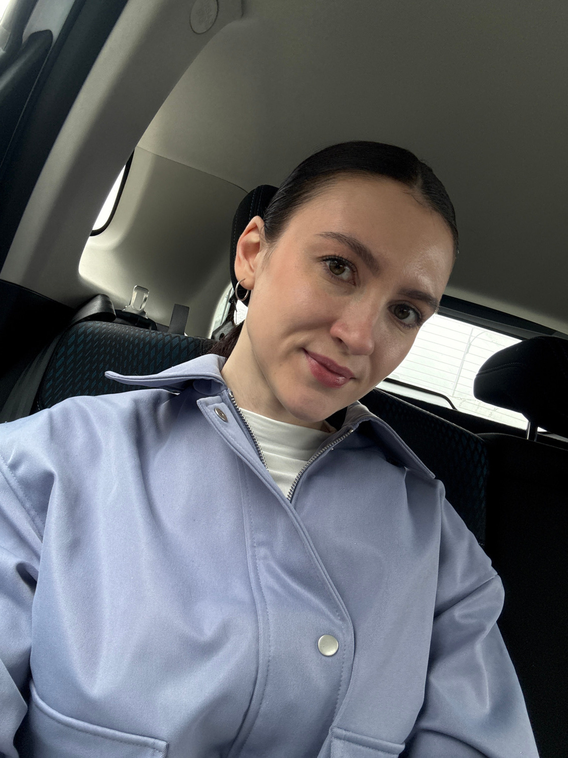 A woman is depicted in a selfie-style photograph taken inside a car. She is positioned towards the right side of the frame, looking directly at the camera with a slight, natural smile. Her dark hair i…read more