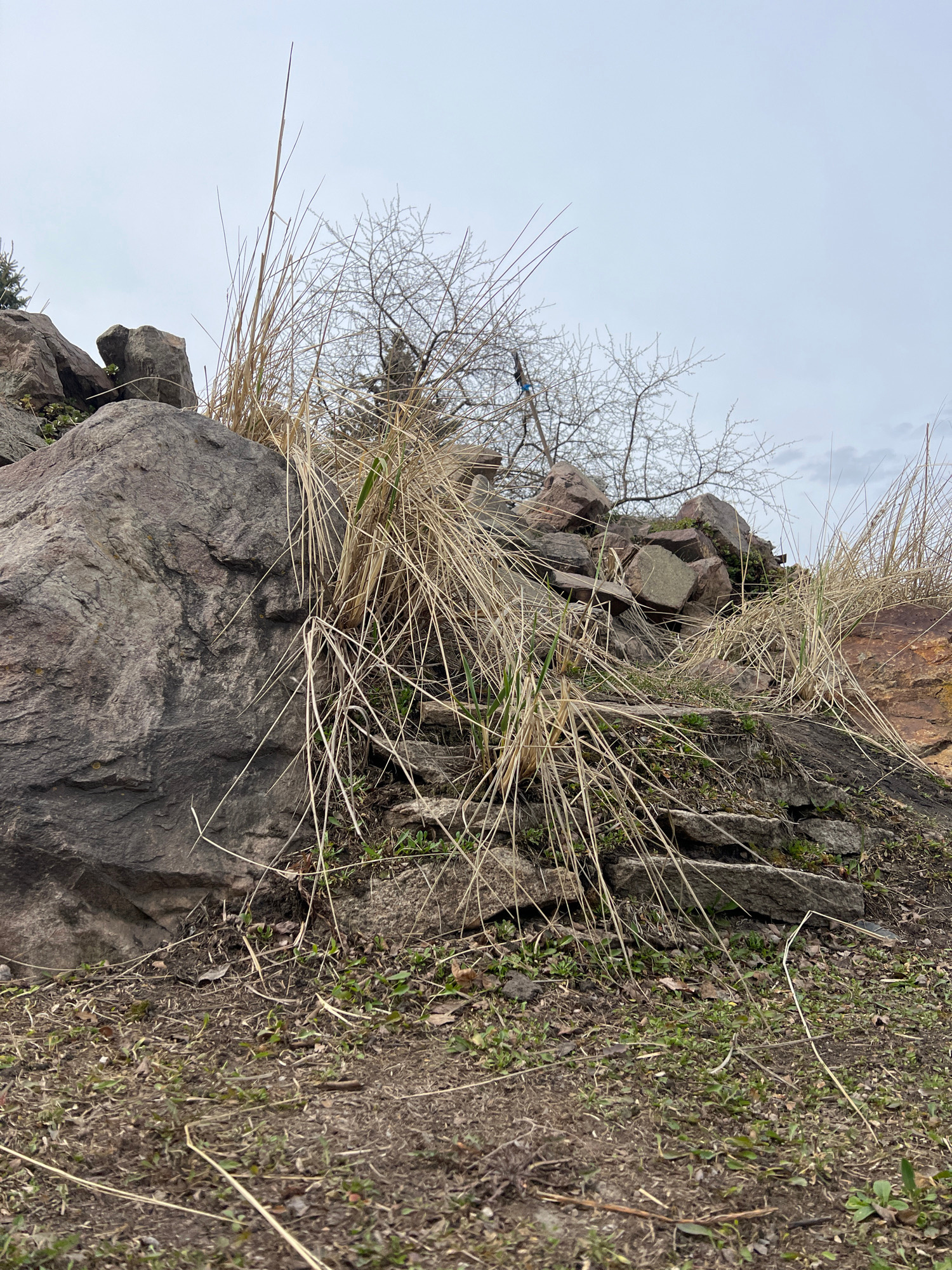 The image depicts a rocky terrain with a large grey boulder dominating the scene. Dry, yellow grasses are prominent, interspersed with some green foliage. A bare tree with thin branches is visible aga…read more