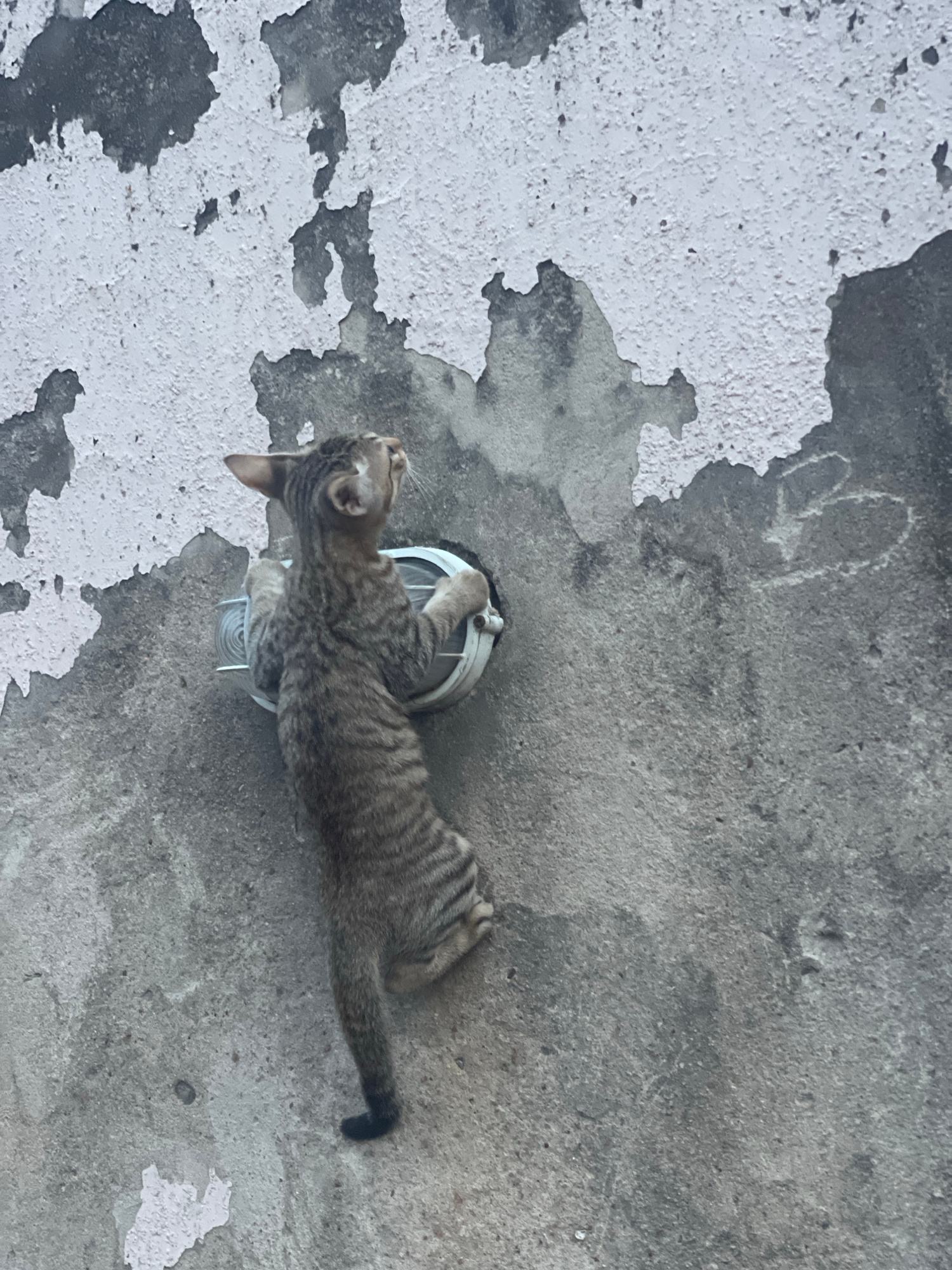 A striped tabby cat lies on a light fixture mounted on a weathered concrete wall. The paint on the wall is peeling and cracking, revealing different layers of color. The cat's head is near the light f…read more