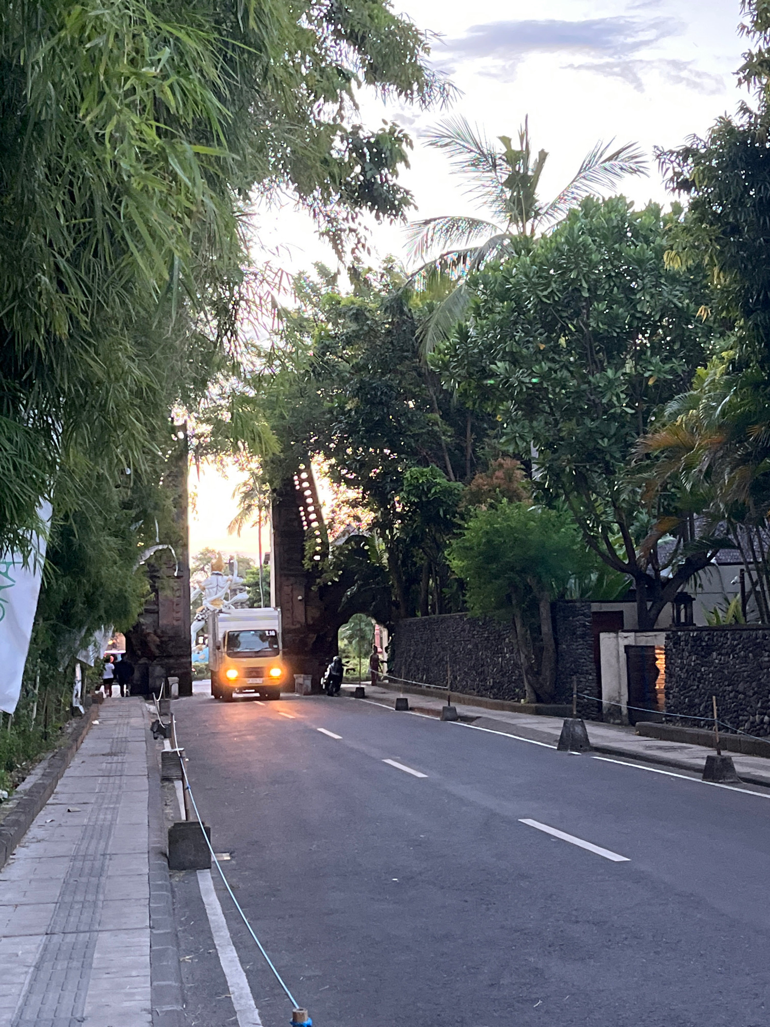 The image presents a street scene in Unknown, Indonesia, where a two-lane road stretches into the distance, flanked by a sidewalk on the right. A white truck with its headlights on is traveling alongβ¦read more