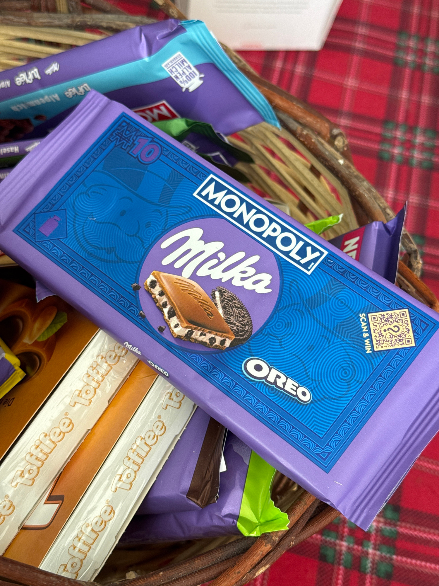 A close-up, indoor shot shows a basket filled with assorted candies and chocolates. Dominating the view is a large, purple "Milka Monopoly Oreo" chocolate bar, prominently displayed. Partially visible…read more