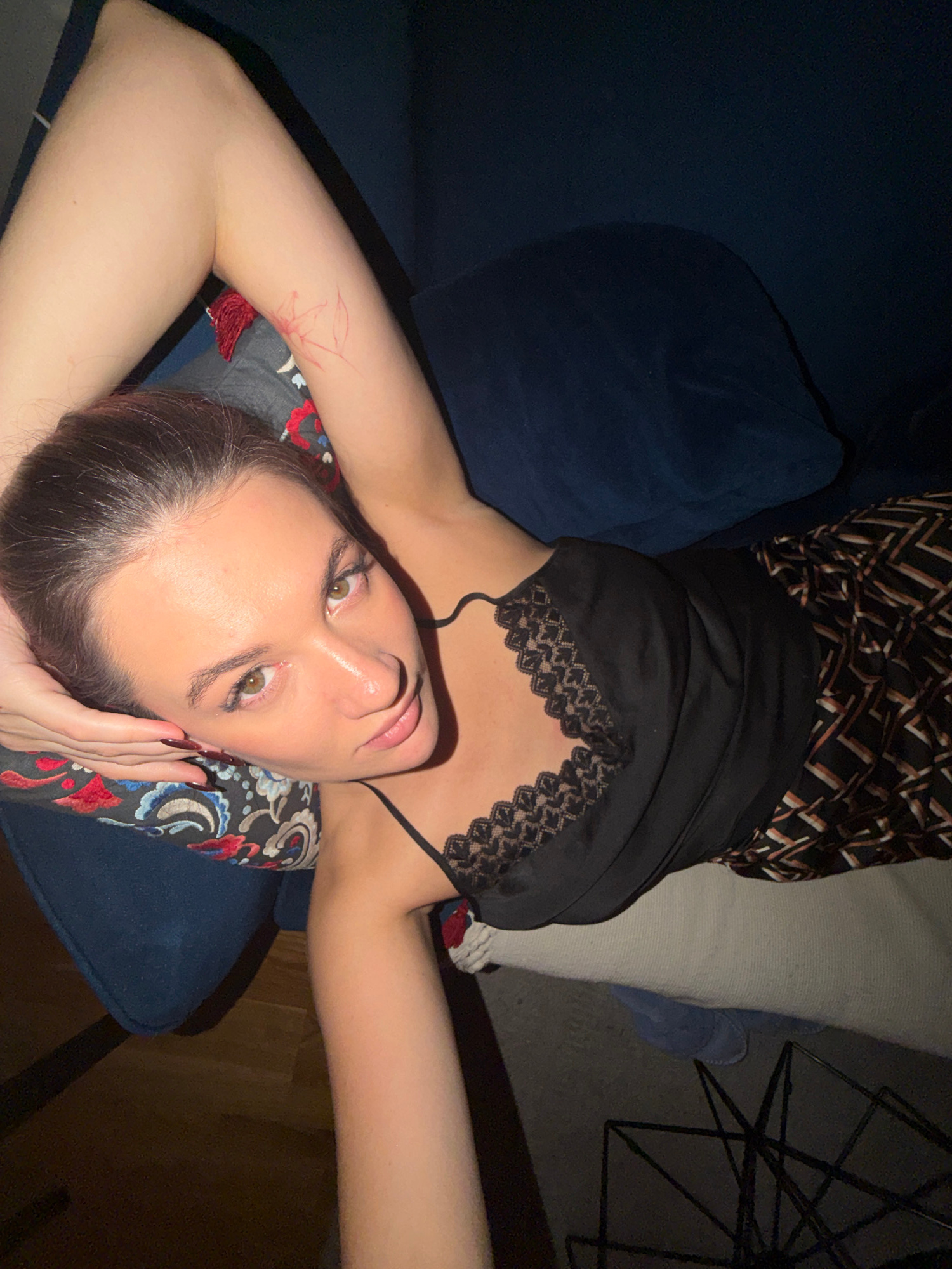 The image displays a young adult female lying supine on an upholstered surface in an interior residential environment located in Belgrade, Serbia. Her head is angled towards the viewer, making direct…read more