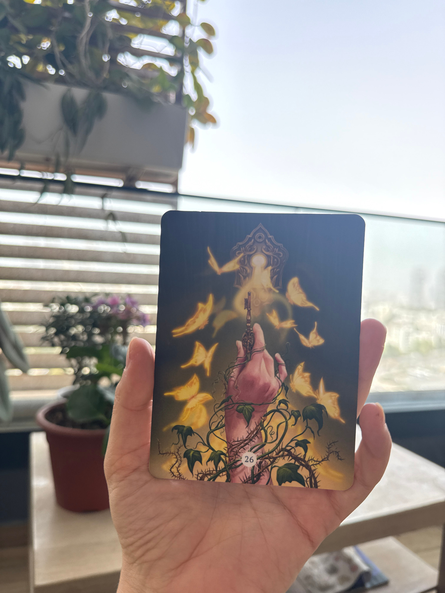 An eye-level indoor shot features a light-skinned hand holding a rectangular card horizontally. The card displays a dark, illustrative artwork: a hand, entwined with dark green, thorny vines, grasps a…read more