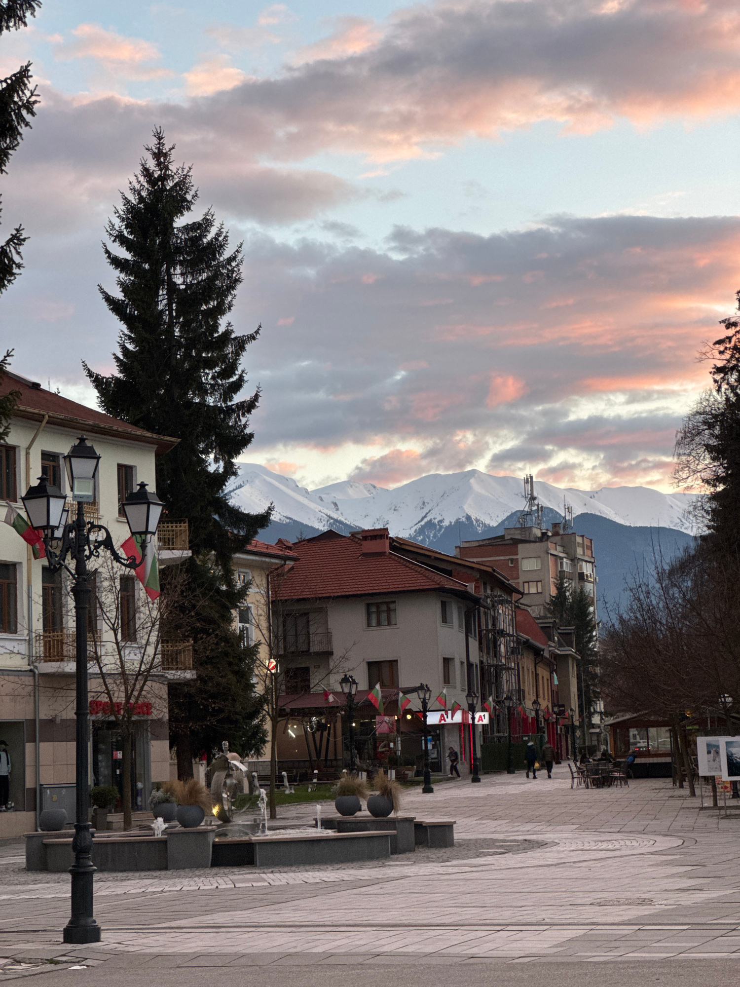 The image depicts a street scene in Razlog, Bulgaria, featuring a paved walkway leading past buildings towards a distant mountain range. The sky is filled with clouds tinged with pink hues, suggesting…read more