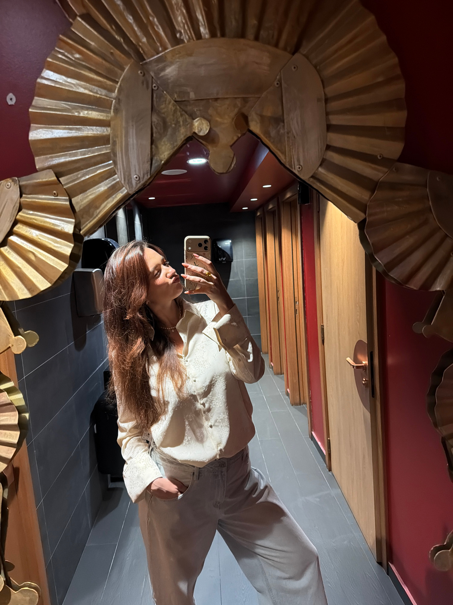 A woman is taking a selfie in front of an ornate, gold-colored mirror. The mirror appears to be in a public space, possibly a restaurant or bar in Belgrade, Serbia. The background shows a red wall and…read more