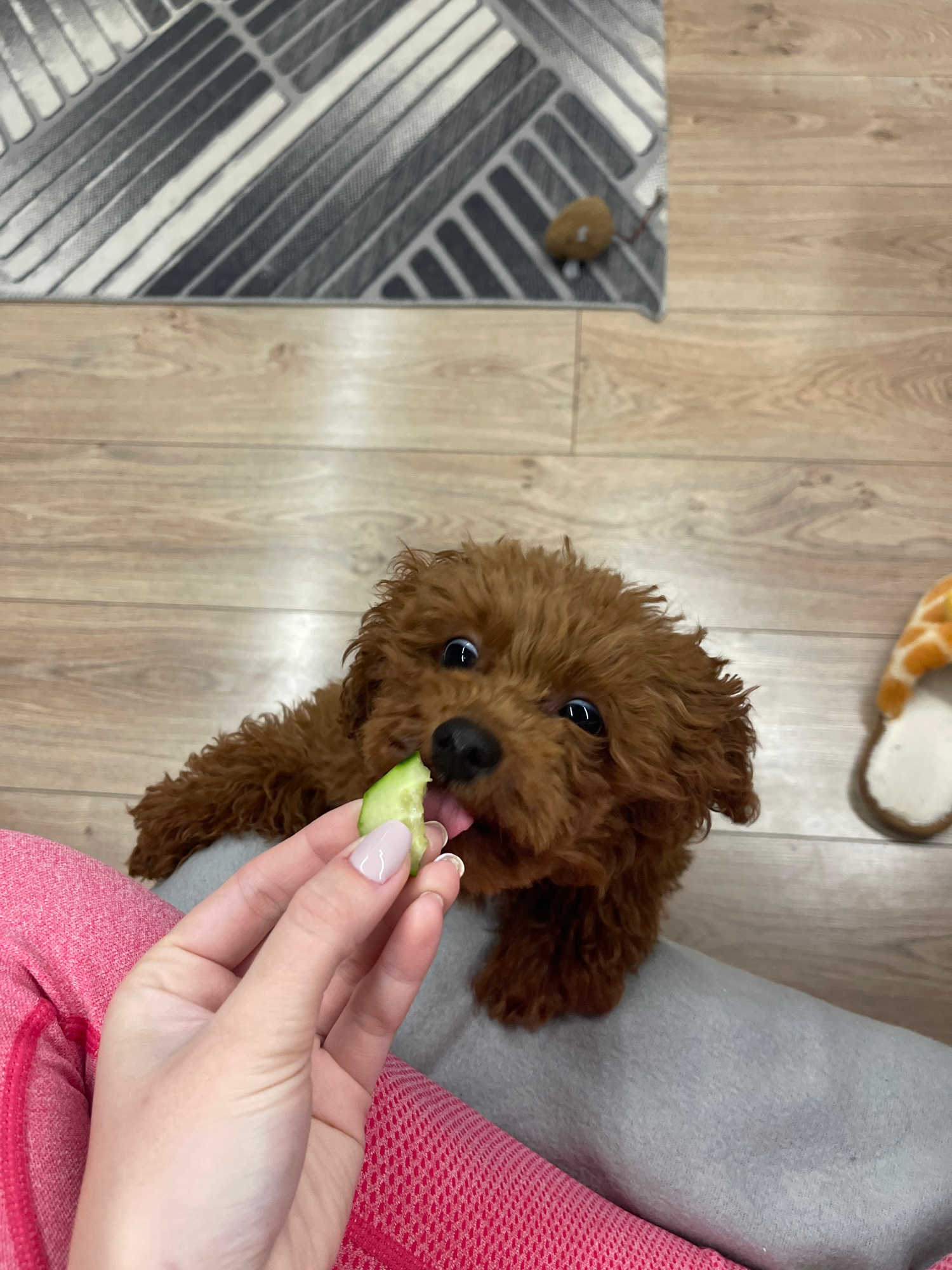 A medium shot captures a small, brown, curly-haired dog being hand-fed a piece of green vegetable indoors. The dog is positioned near a woman's hand, as she is holding a slice of a green vegetable, po…read more