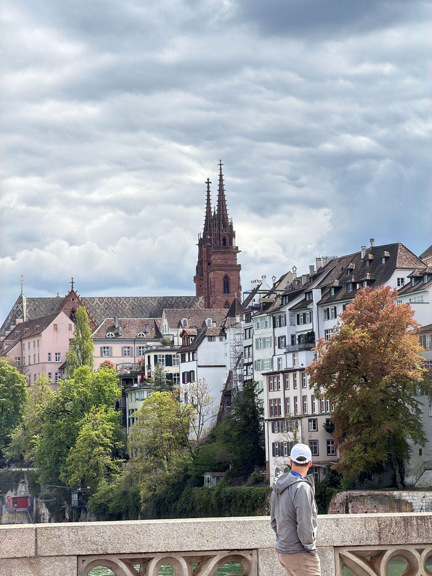 The image, originally rotated, depicts a scenic daytime view of Basel, Switzerland, likely from a bridge overlooking the Rhine River and the city's historic architecture. In the immediate foreground o…read more