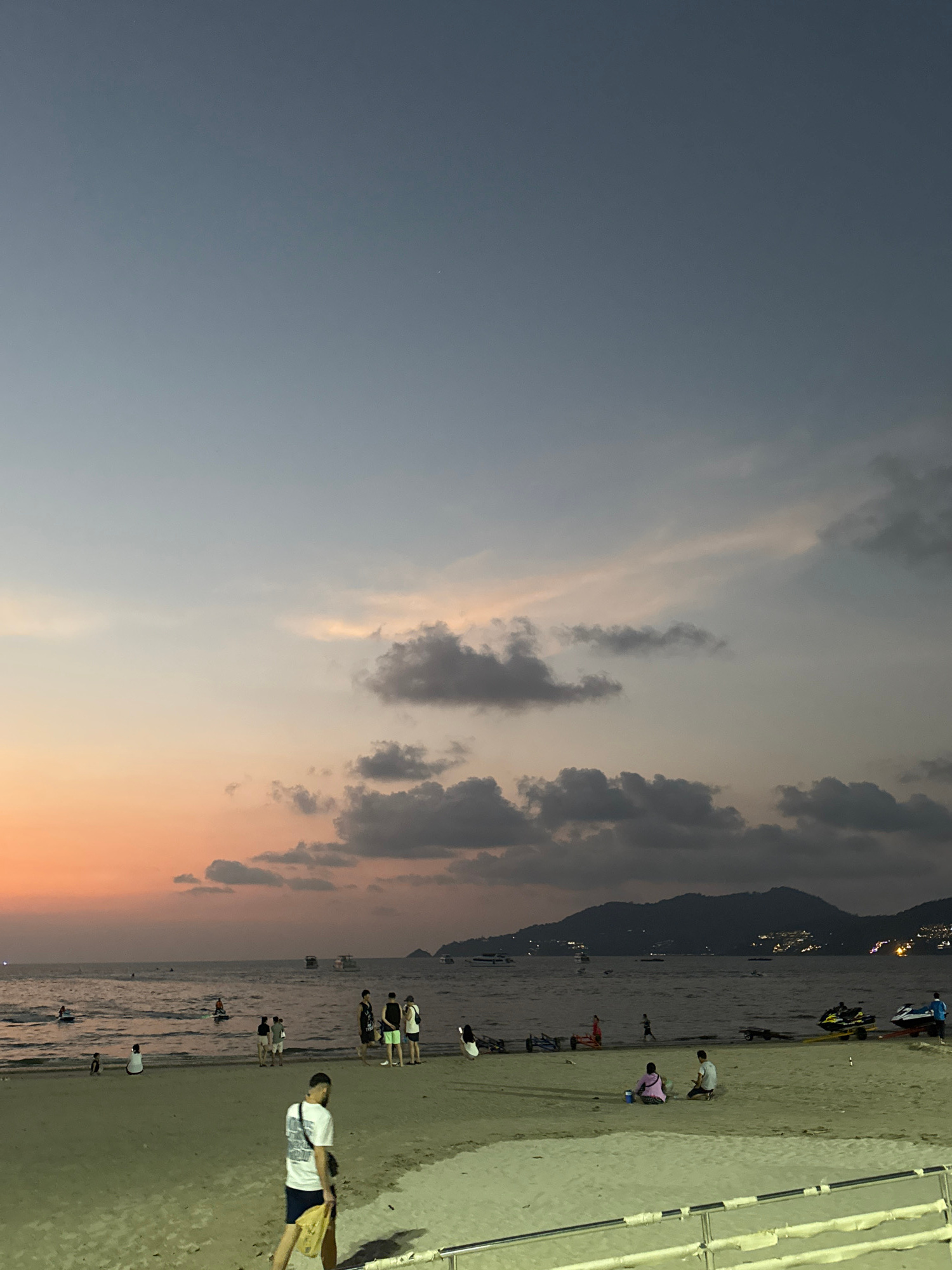 The image shows a beach scene in Patong, Thailand, at dusk. The sky transitions from a dark gray to an orange-tinted horizon, with scattered clouds. Along the coastline, there are clusters of people.…read more