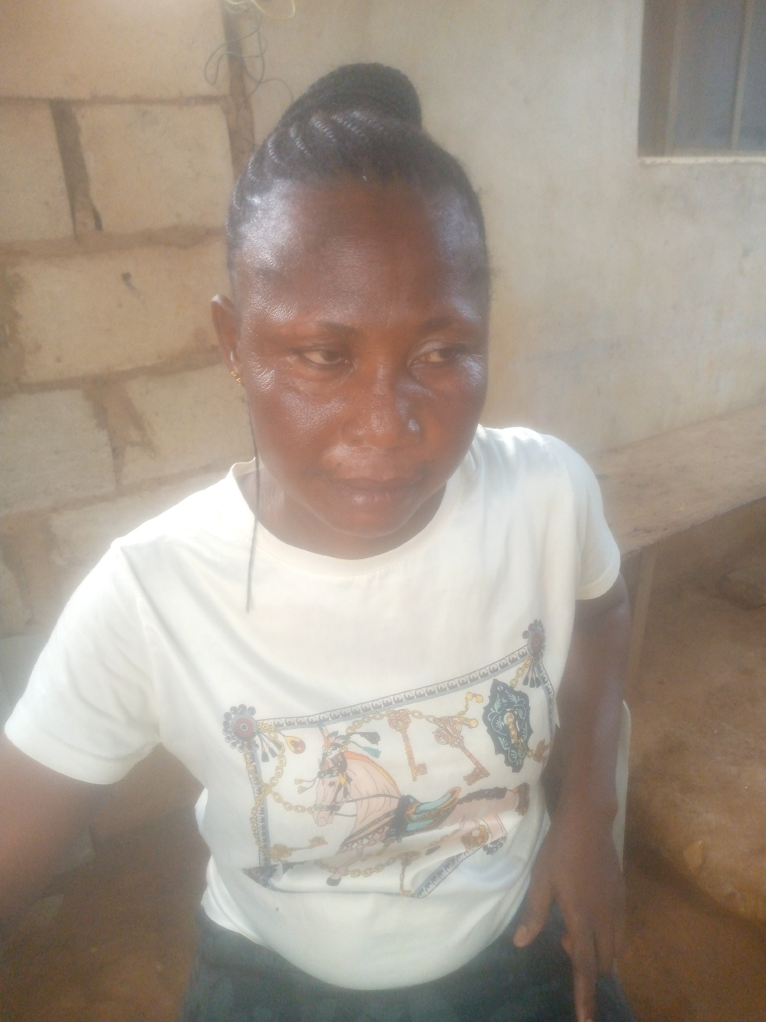 A close-up, medium-shot portrait depicts a woman with dark skin, likely of African descent. Her braided hair is pulled back into a neat bun on top of her head, and she wears small gold stud earrings.…read more