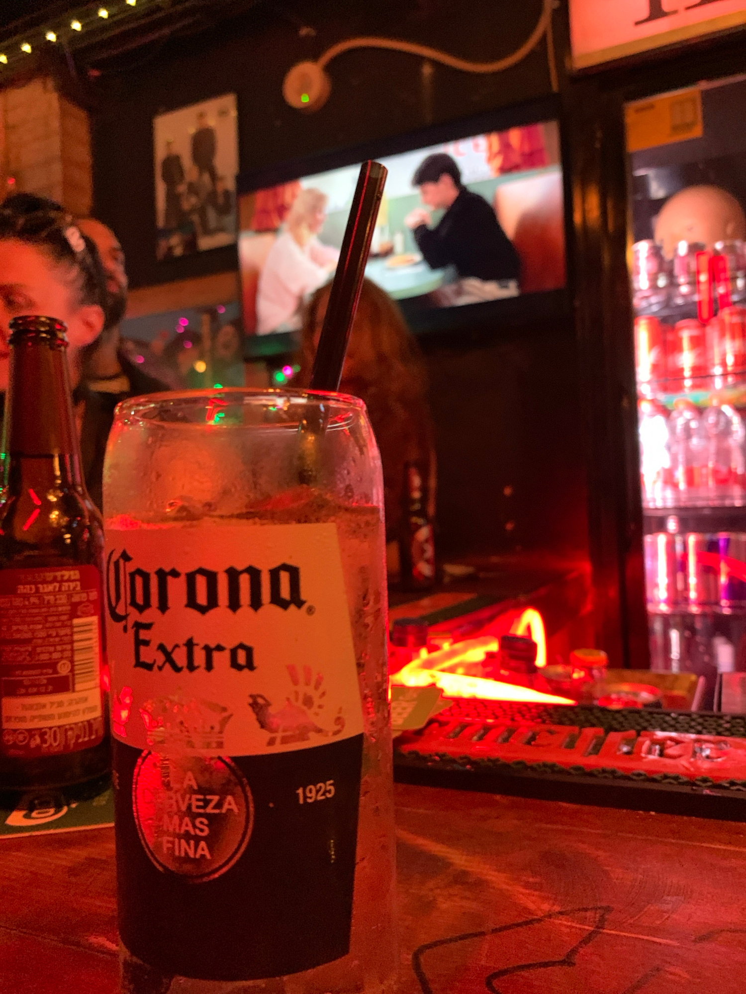 The scene is an indoor bar, likely in Tel Aviv, Israel, given the presence of a Corona Extra beer bottle and drink. The bar is dimly lit with red lighting. In the foreground, a partially full glass of…read more