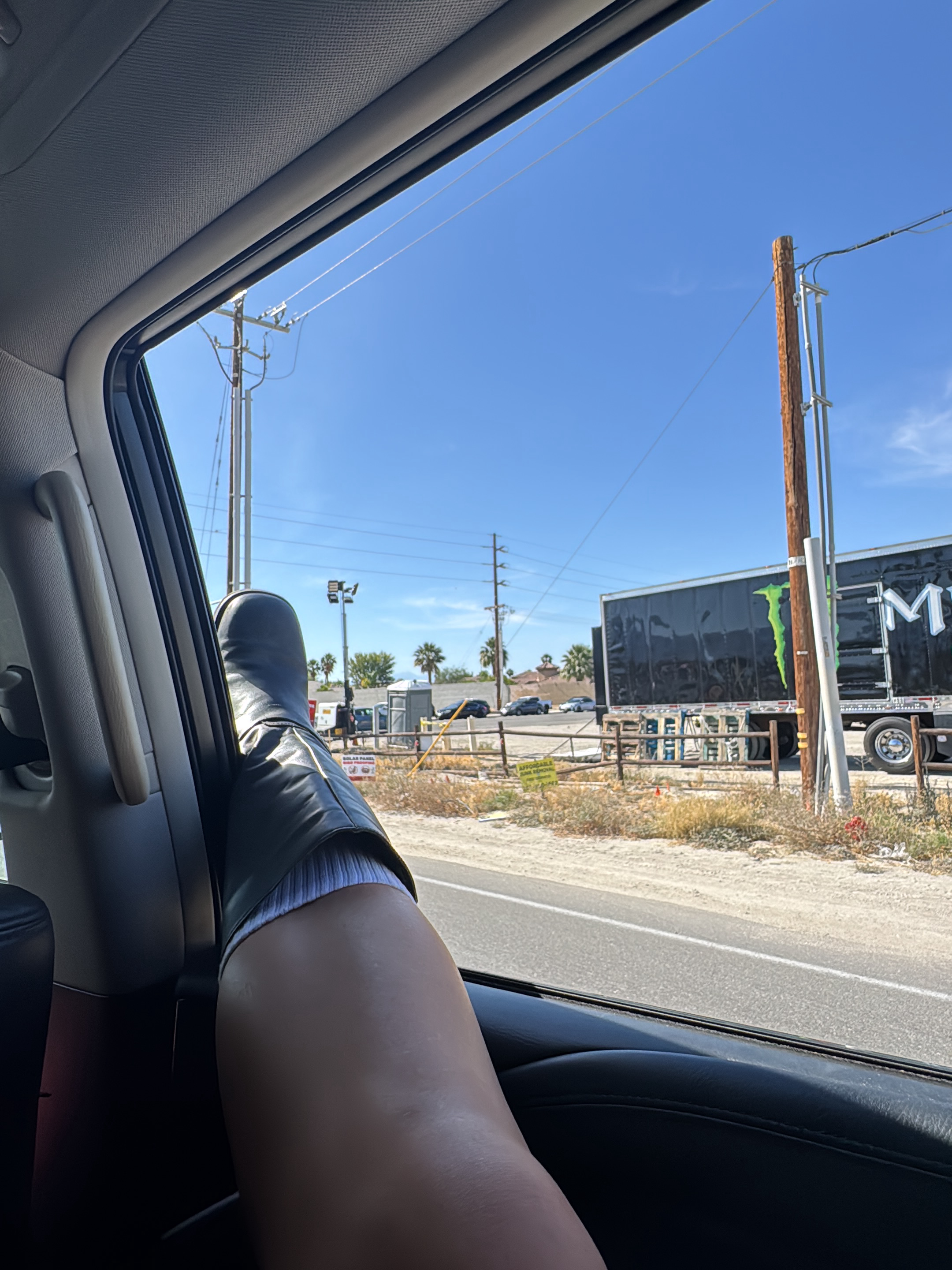 The view from inside a car traveling down a paved road in Coachella, United States, reveals a clear, blue sky. Power lines and utility poles run alongside the road. A black semi-truck with a green "Moโฆread more