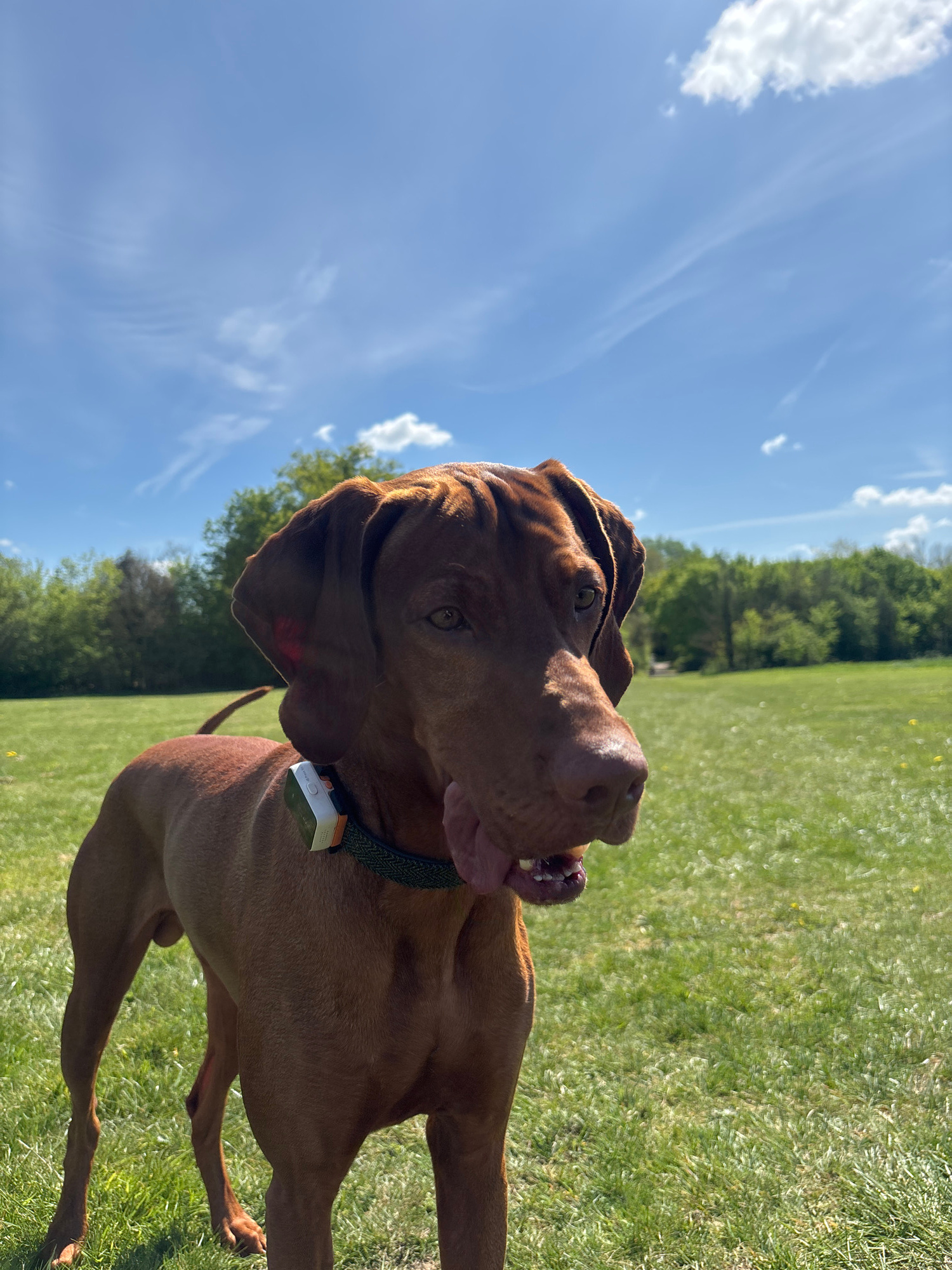 The image shows a brown Vizsla dog with its tongue out, standing on green grass under a bright blue sky with scattered clouds. A wooded area is visible in the background. The dog wears a dark green co…read more