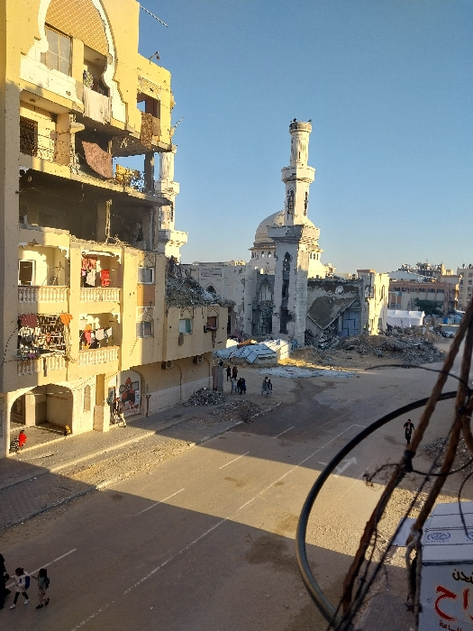 This image captures a street scene in Khan Yunis, Palestinian Territory, during daylight hours. The prominent feature on the left is a multi-story, light-colored building exhibiting severe structural…read more