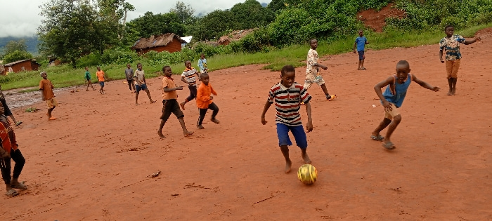 In the city of Ngalula, Democratic Republic of the Congo, a group of approximately 15 children is engaged in a game of soccer on a reddish-brown dirt field. The field is expansive, showing an uneven s…read more