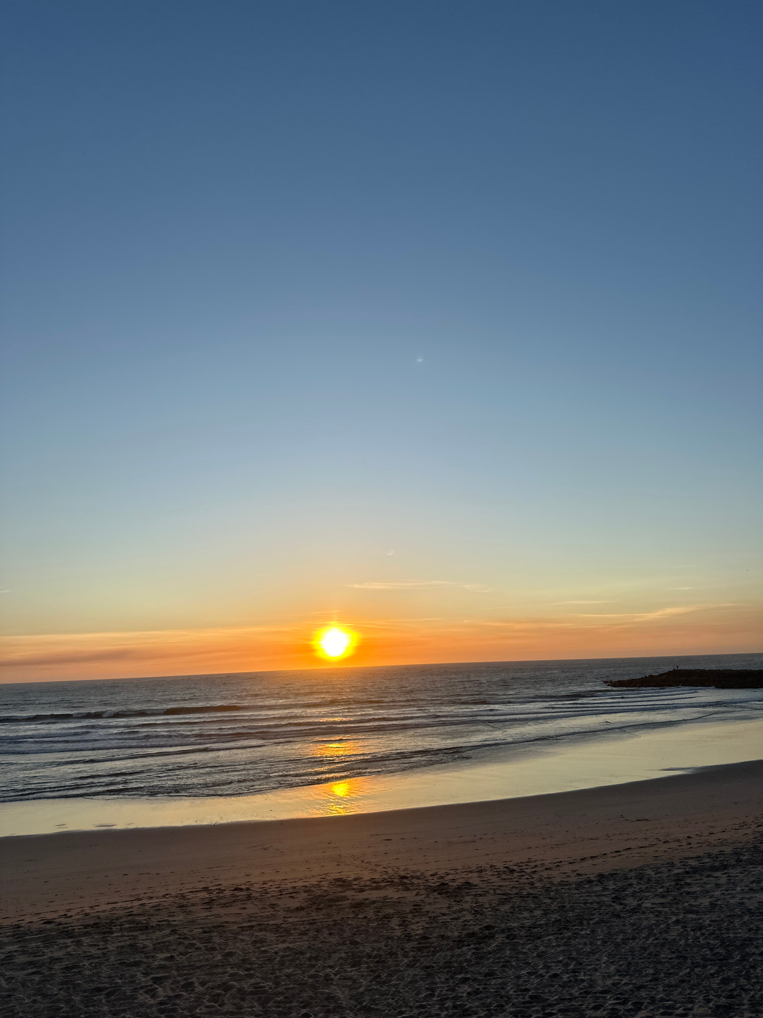 The image shows a sunset at the beach. The scene features the sun setting over the ocean horizon, casting a warm golden light. A large expanse of blue sky is visible. The beach's sandy texture contras…read more