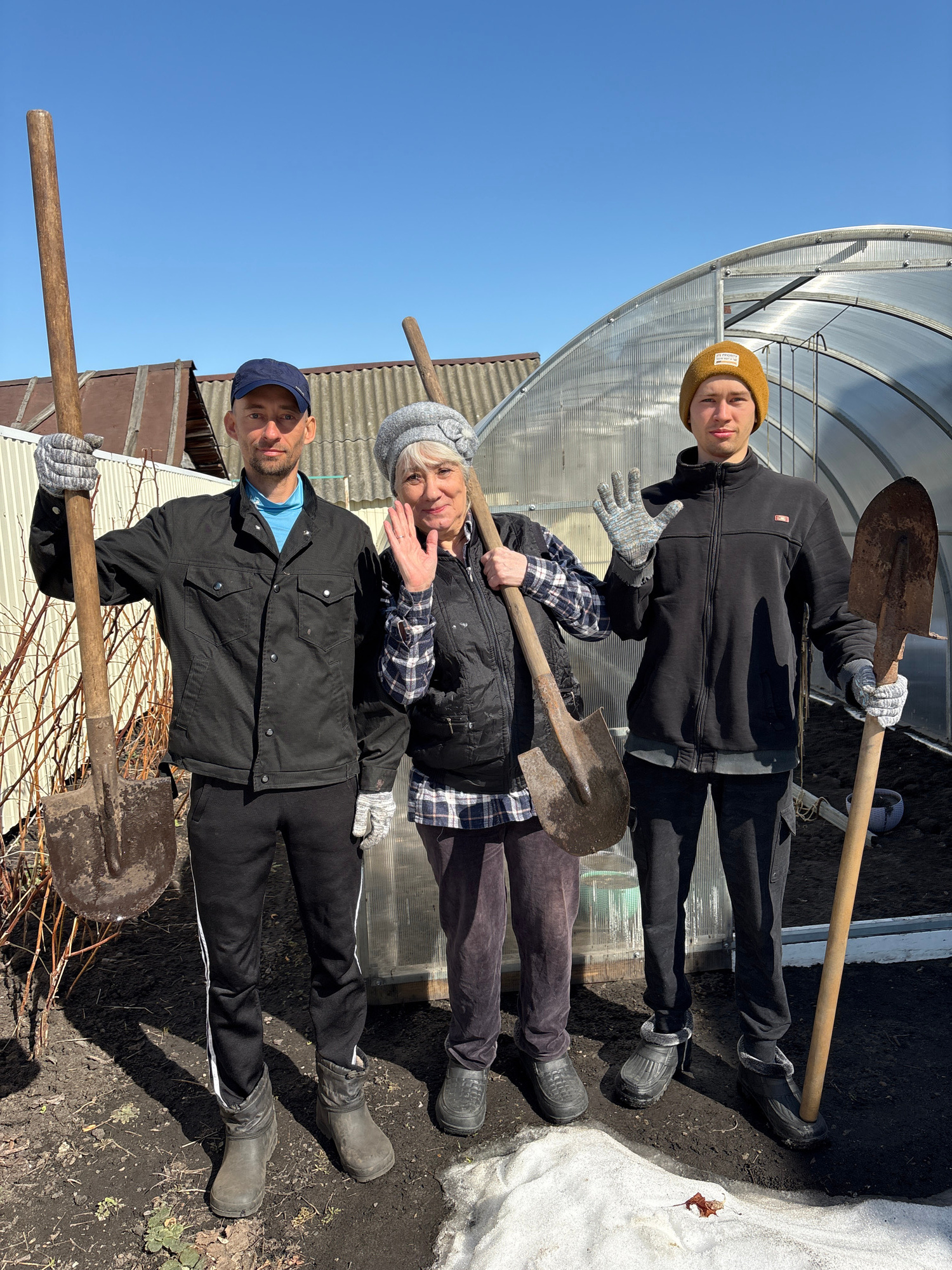 Three individuals are standing outdoors, holding shovels. A younger individual, wearing a yellow beanie and a black jacket, stands at the top. Below is a middle-aged woman wearing a grey hat and a pla…read more
