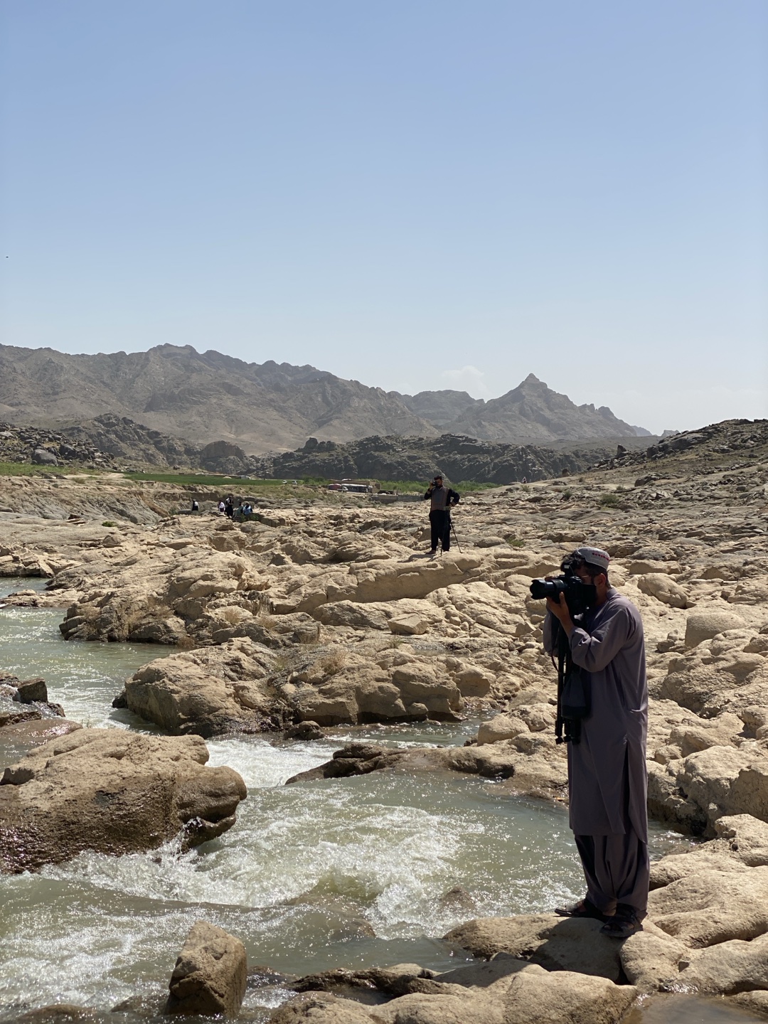 The scene depicts a rocky riverbed in Abdol Ahadkhan Kariz, Afghanistan, under a clear sky. A man wearing a traditional robe and cap is standing on the rocks, holding a video camera and filming. Furth…read more