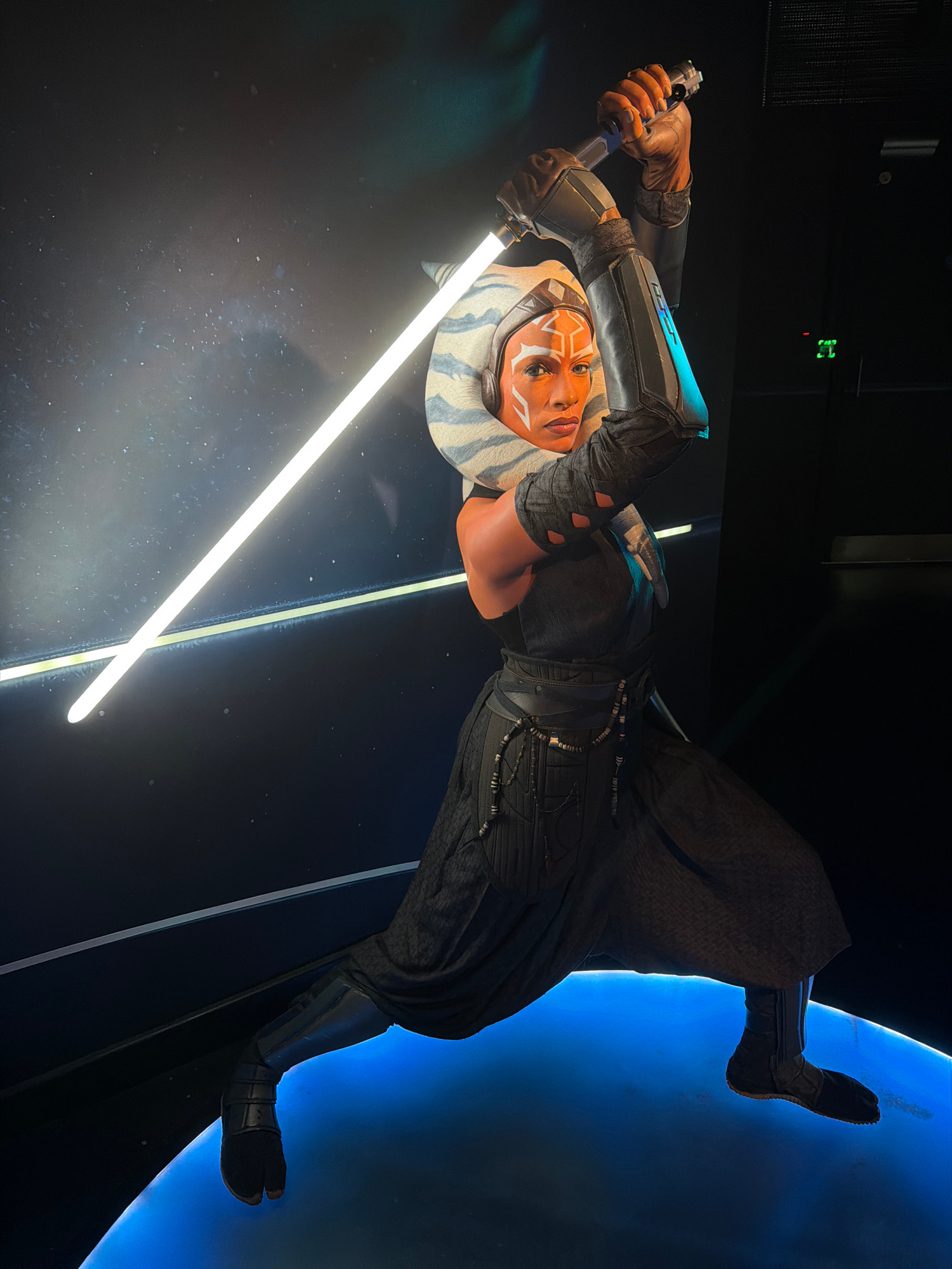 The image shows a statue of Ahsoka Tano, a character from the Star Wars franchise, holding two lightsabers. She is wearing a dark outfit with light blue accents on her arm guards and head tails. The s…read more