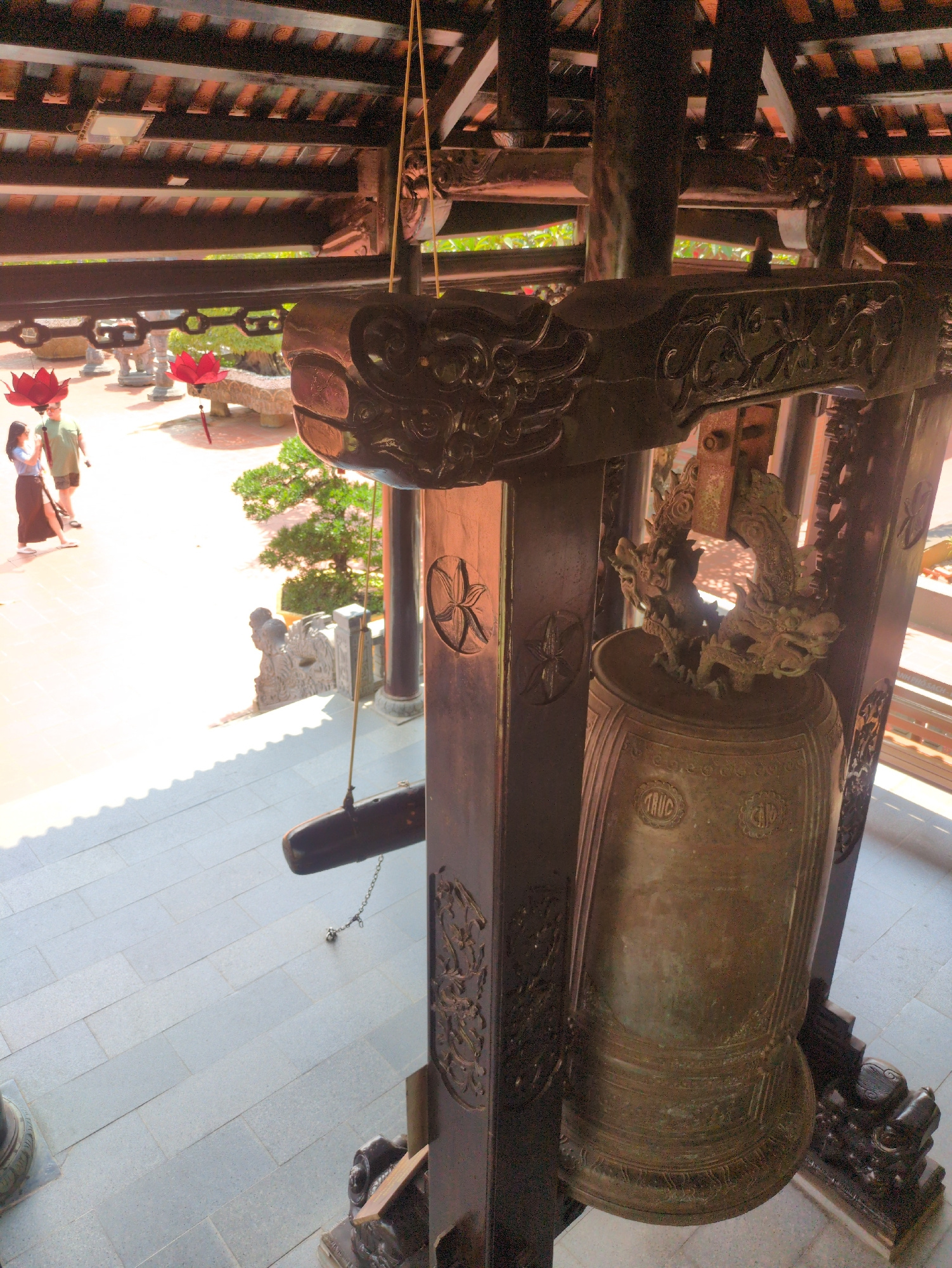 The image shows a large bronze bell mounted within a wooden framework, likely at a Buddhist temple in Phú Quốc, Vietnam. The framework is intricately carved with decorative elements. The bell is posit…read more