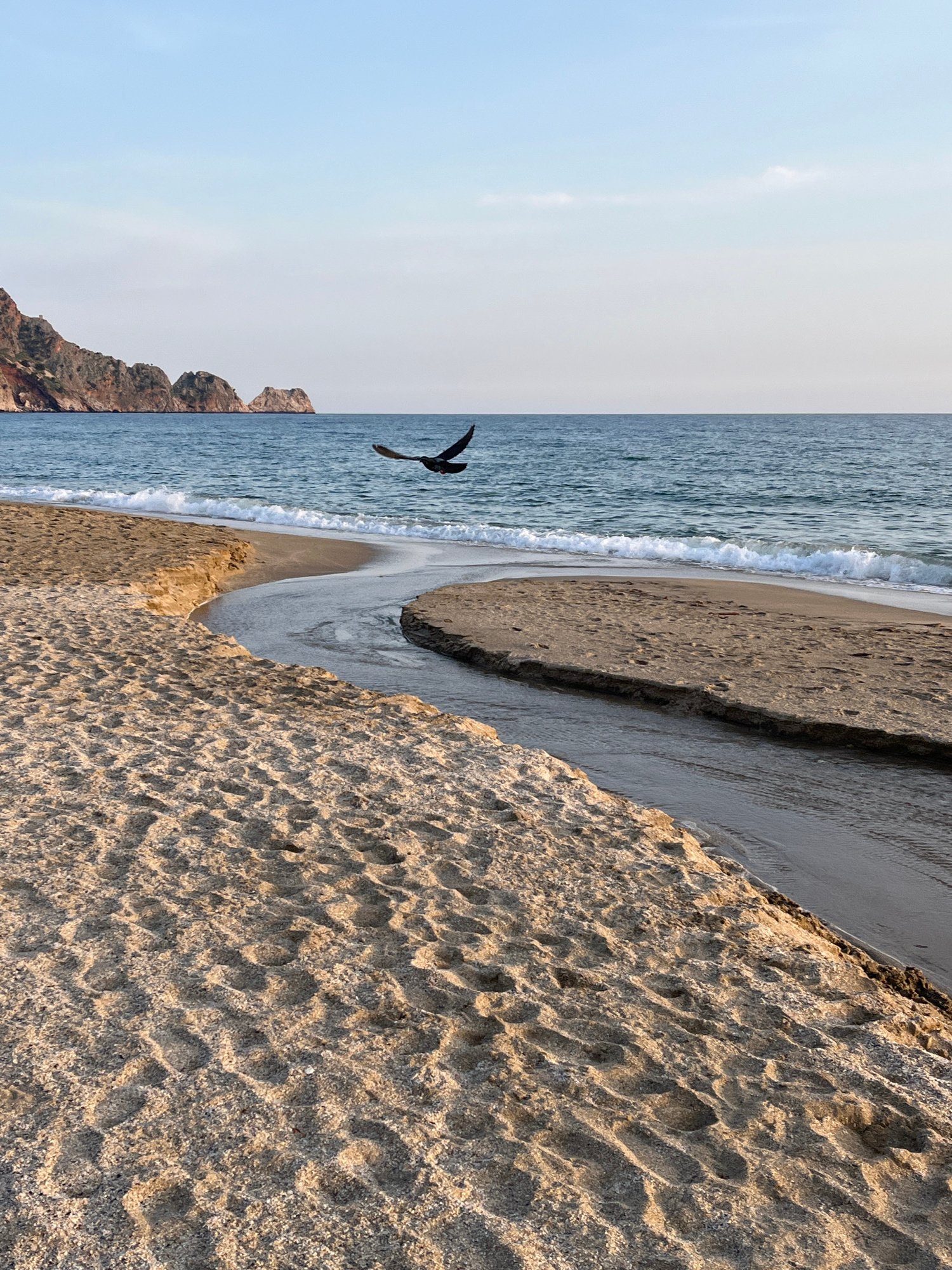 The image depicts a beach scene with a bird in flight, taken in Alanya, Turkey. The environment includes a sandy beach with visible footprints, a body of water with small waves, a rocky cliff formatio…read more
