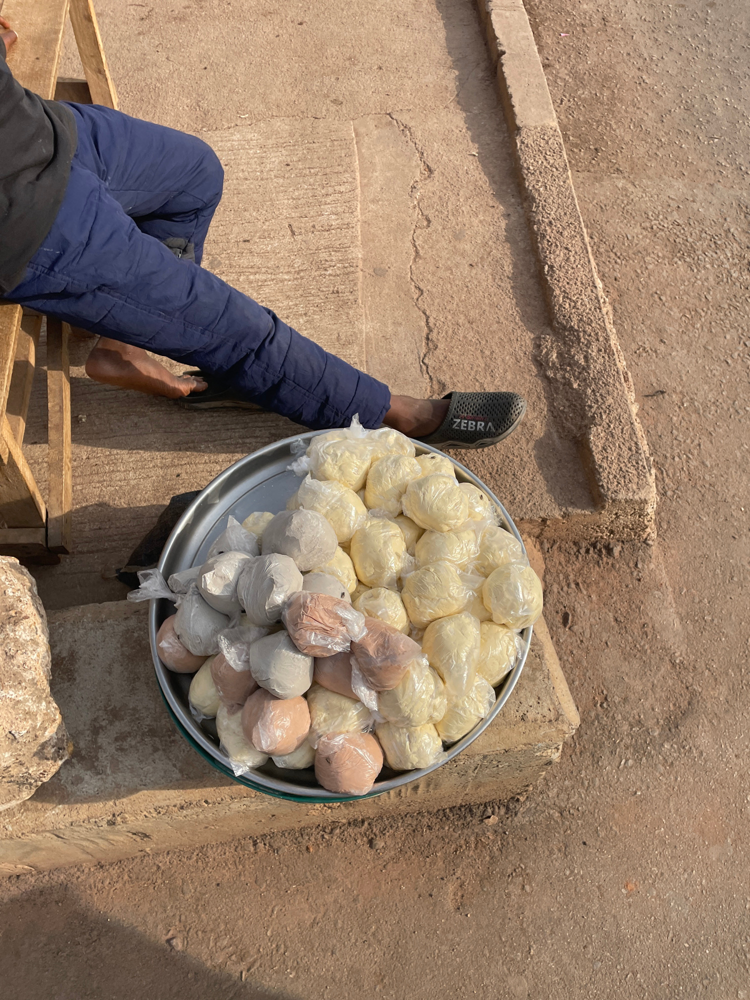 A street vendor is sitting on a wooden pallet next to a concrete ledge in Barakin Lerawi, Nigeria. He is wearing dark blue quilted pants, a black shirt, and a single gray Zebra-branded slipper. His le…read more